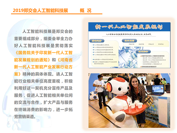 人工智能科技展(AIExpo)作为高技术产业展是郑州全国商品交易会的重要组成部分,组委会举全力办好人工智能科技展是贯彻落实《国务院关于印发新一代人工智能发展规划的通知》和《河南省新一代人工智能产业发展行动方案》精神的具体体现。展会期间将举办多场精彩的主题活动研讨产业发展趋势,请人工智能行业相关单位高度重视,积极利用好这一契机充分宣传产品及服务,促进人工智能相关单位间的交流与合作,扩大产品与服务在终端消费的影响力,进一步拓宽营销渠道。