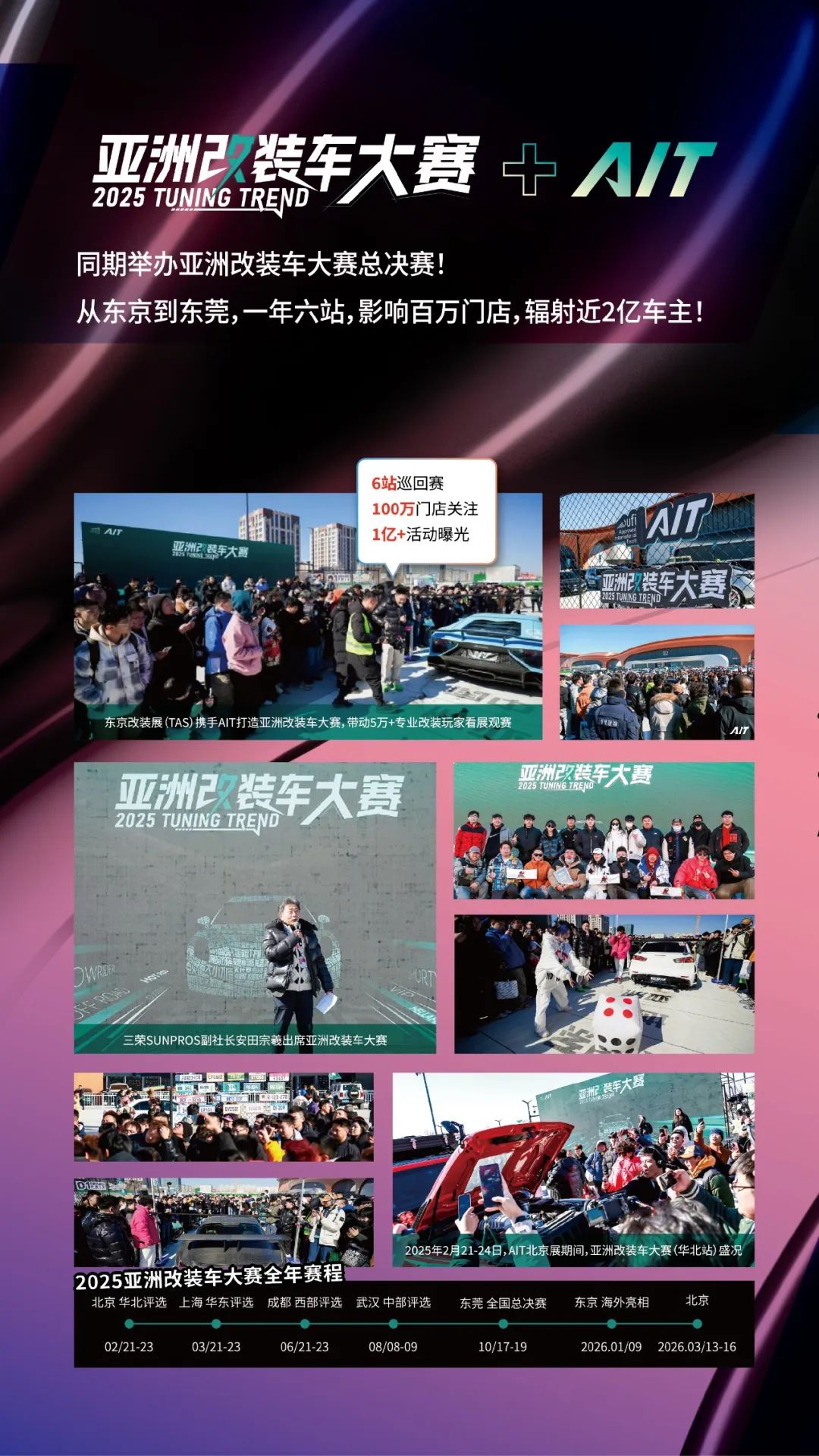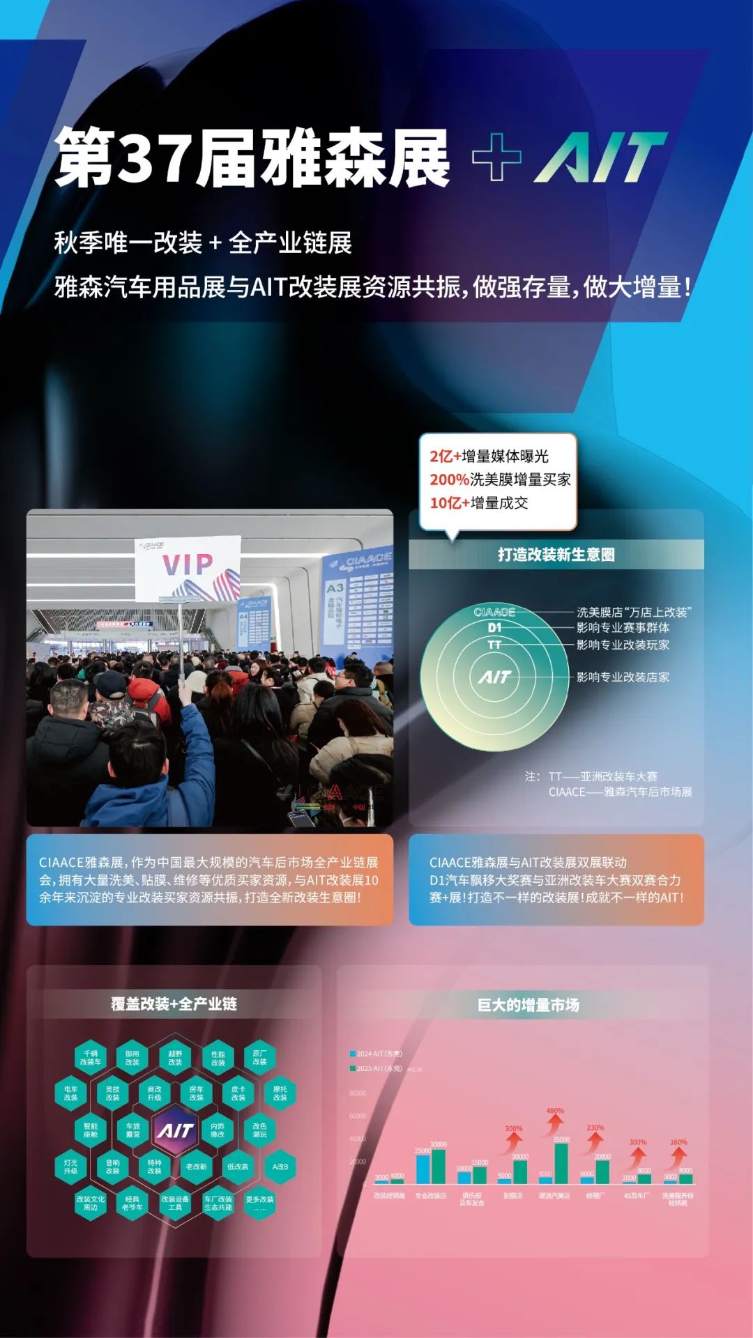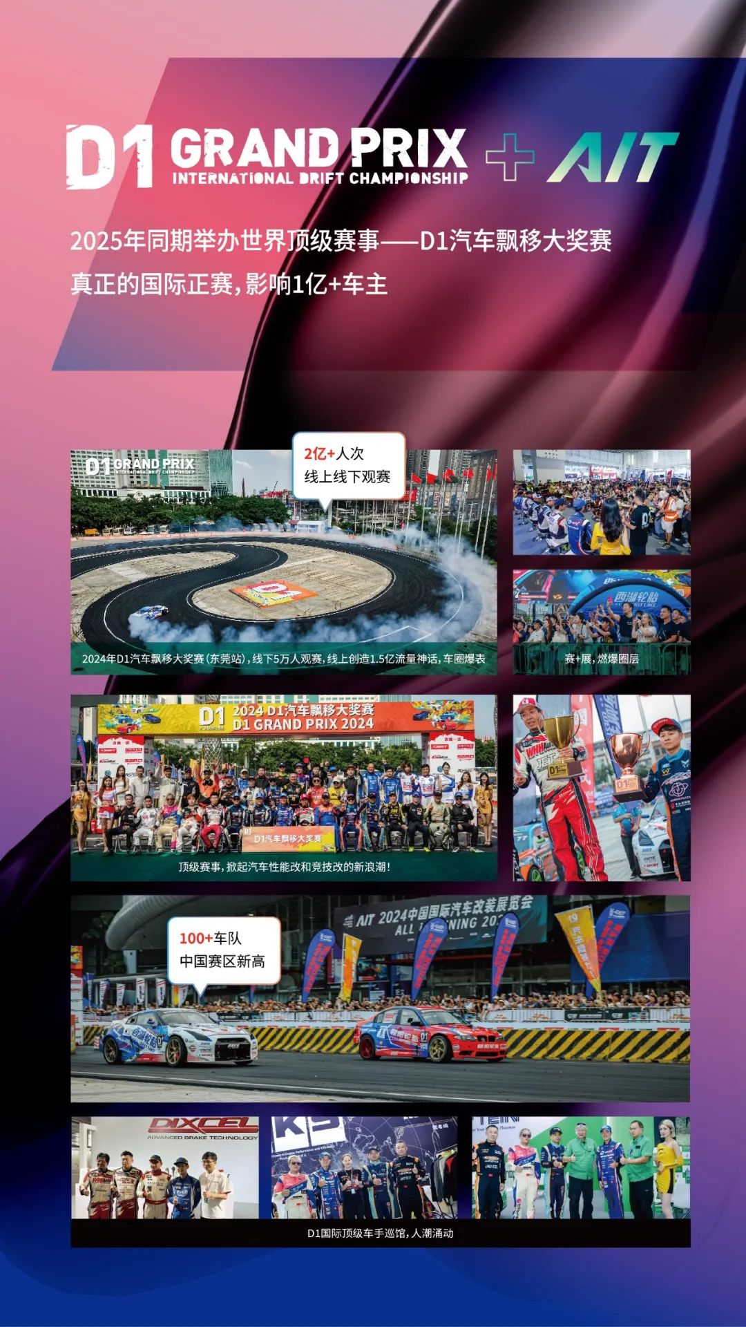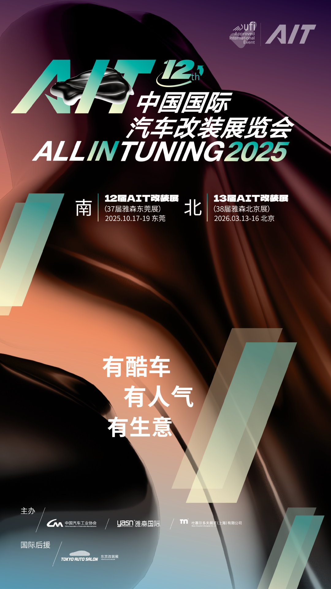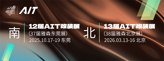 2025年10月17-19日,第12届AIT改装展在东莞举行。D1汽车飘移大奖赛官方正赛东莞站、亚洲改装车大赛年度总决赛、37届雅森东莞展将同期举行,并特邀神秘人气嘉宾驻场。四大王牌、效果之上做人气、人气之上显专业。