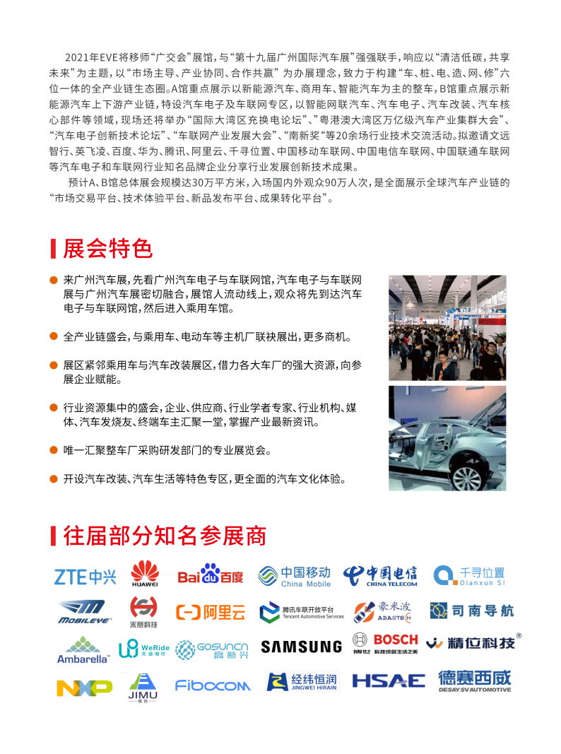 2021年广州国际汽车电子展览会与第十九届广州国际汽车展同期联合举办。届时,A区和B区展览总面积预计将达25万平方米,吸引国内外观众78万人次,其中A区重点展示整车企业,预计有来自全球的86+整车厂,10+造车新势力,达1200台展车同时亮相,其中,新能源汽车将达到180+台,B区重点展示国际顶级豪车及汽车产业链上下游配套企业,包括智能网联汽车、汽车电子、汽车改装、汽车核心部件、新能源汽车等,预计将吸引600+家知名企业参展,展会期间还将举办30多场专题论坛,为汽车电子智能化发展提供整体解决方案。