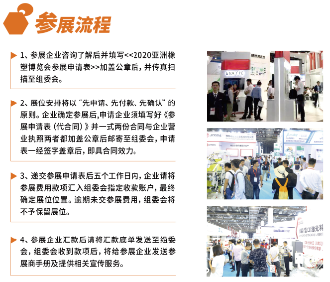 1、参展企业咨询了解后并填写<<2020亚洲橡塑博览会参展申请表>>加盖公章后,并传真扫描至组委会。