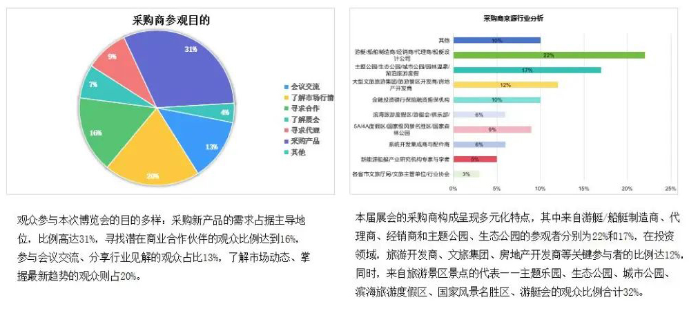 观众参与本次博览会目的多样,其中以采购商品、了解市场走向、谋求合作伙伴为主要目的。而在采购商品的观众群体中,游艇/船艇制造商、代理商、经销商和文旅集团是重要的采购商。此外,观众群体来自世界各地,国内的观众有近一半来自本省(广东省)为主,国外的观众则多来自东南亚、日韩、欧美和澳洲地区。