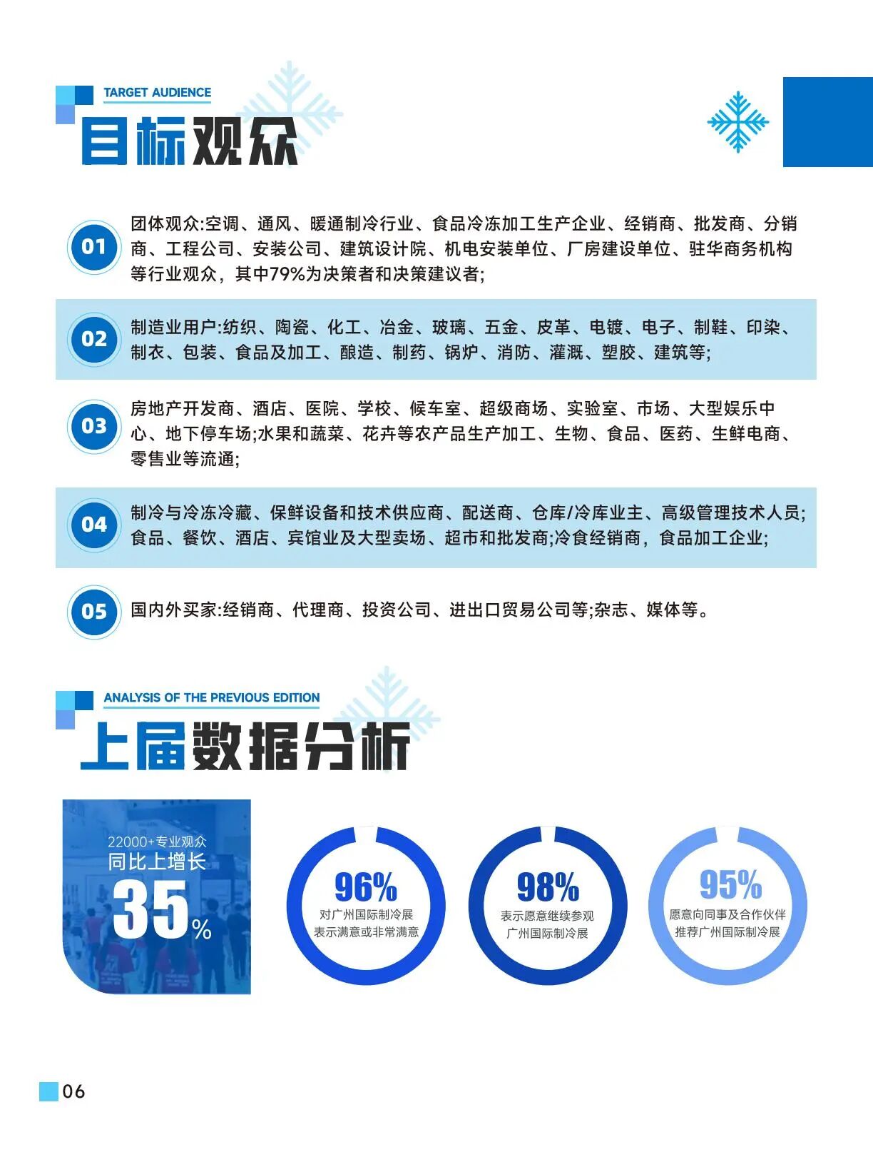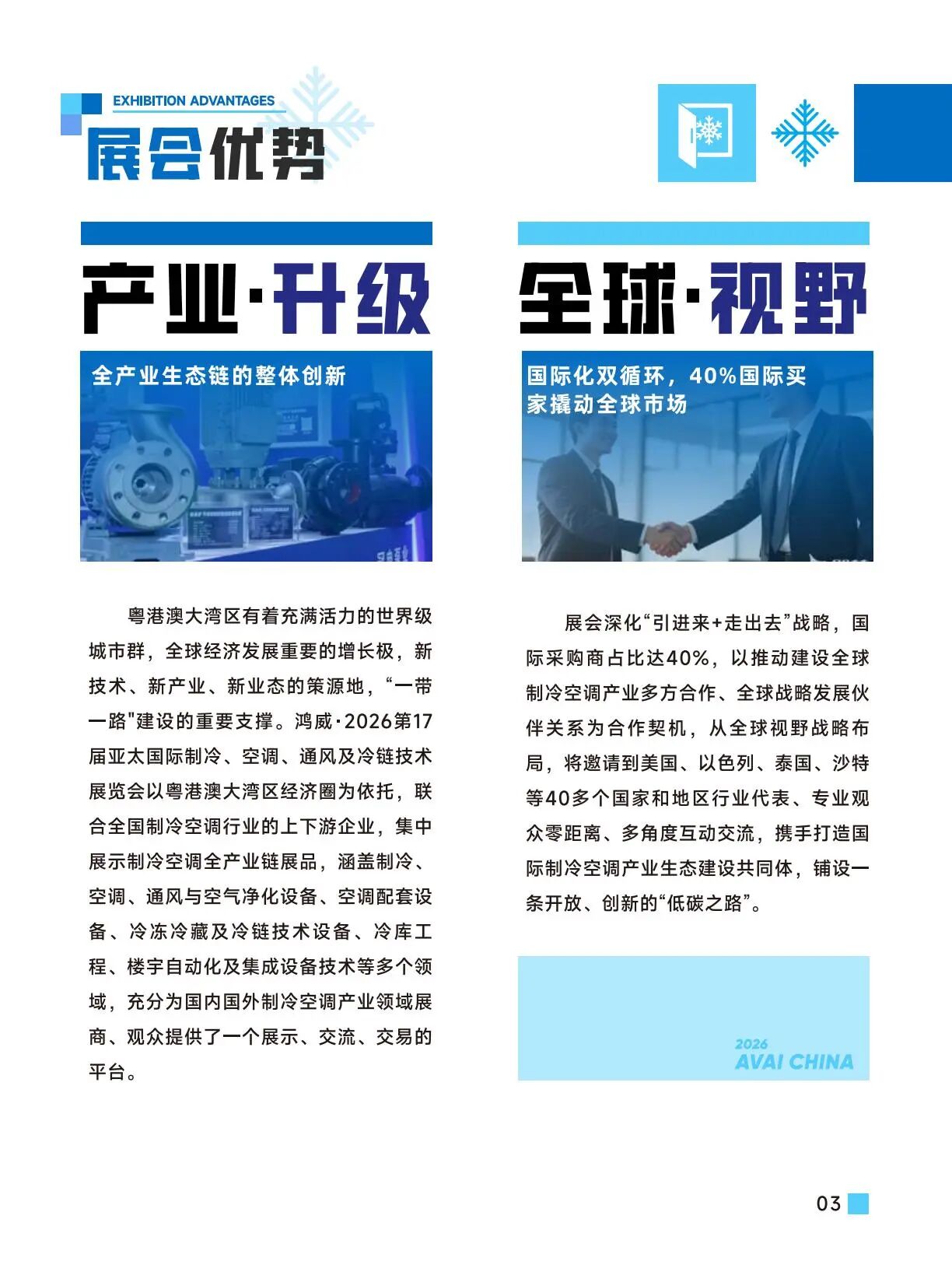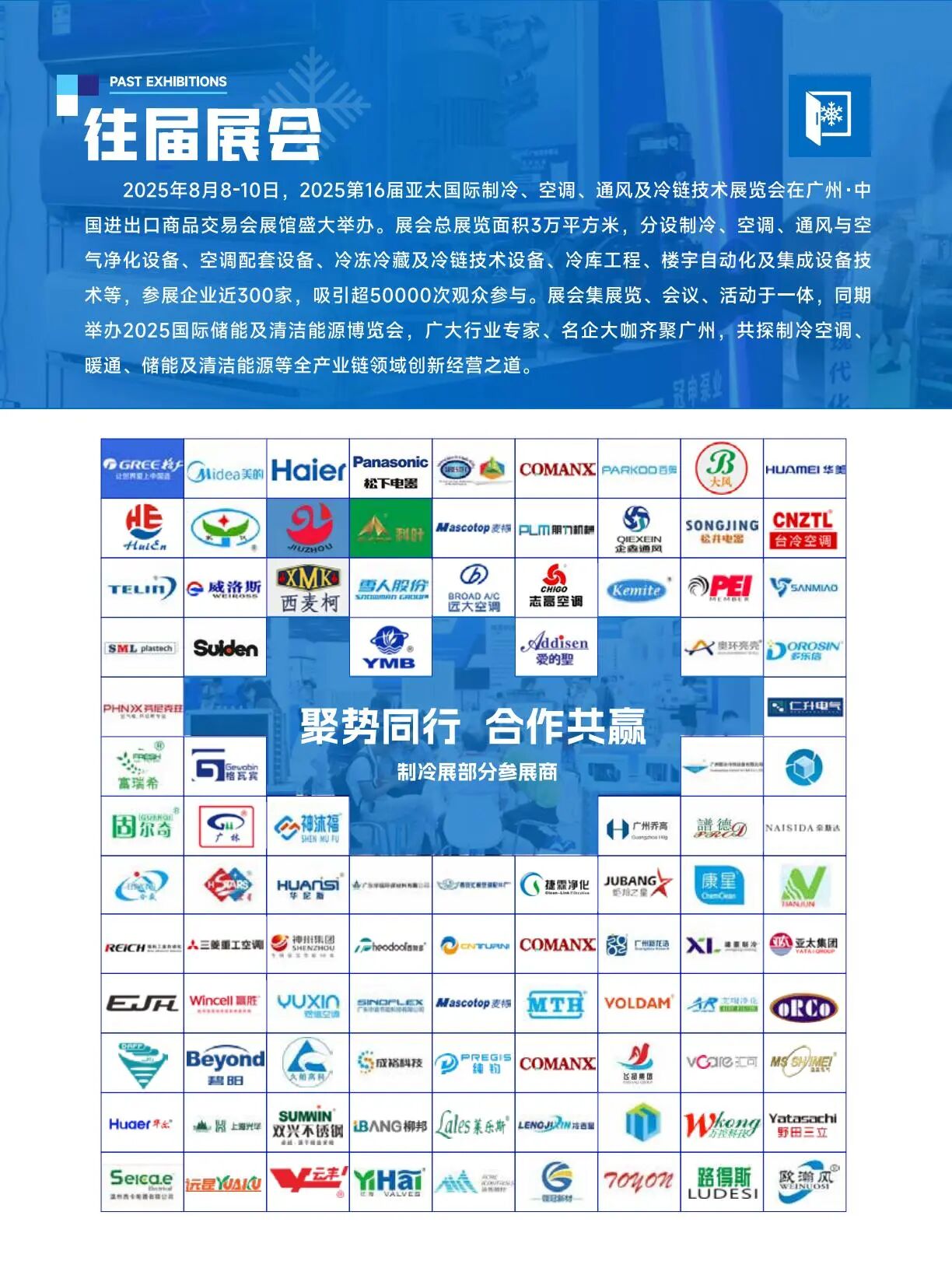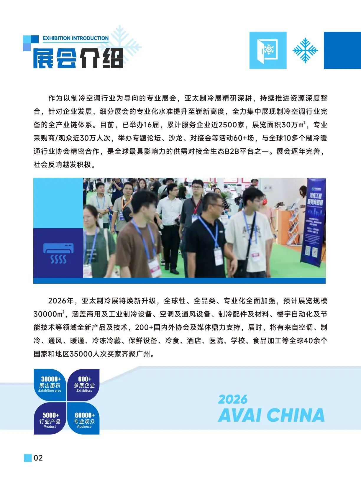2026年,亚太制冷展将焕新升级,全球性、全品类、专业化全面加强,预计展览规模30000㎡,涵盖商用及工业制冷设备、空调及通风设备、制冷配件及材料、楼宇自动化及节能技术等领域全新产品及技术,200+国内外协会及媒体鼎力支持,届时,将有来自空调、制冷、通风、暖通、冷冻冷藏、保鲜设备、冷食、酒店、医院、学校、食品加工等全球40余个国家和地区35000人次买家齐聚广州。