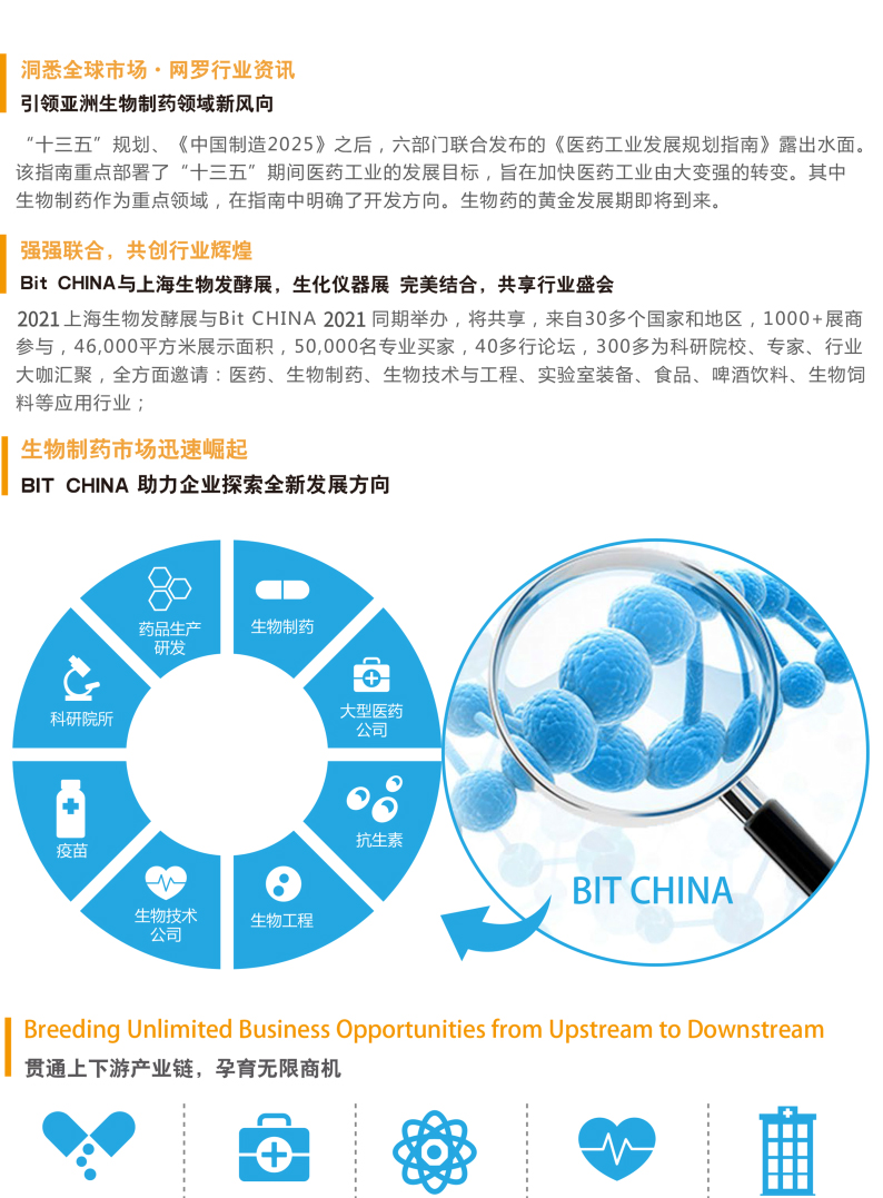 中国生物制药产业正经历着非常快速的发展。预计到2022年,全球生物技术药物将占全部药品销售收入比重的三分之一以上。“2021海国际生物制药与技术装备展”契合生物制药行业蓬勃发展的大趋势,聚焦基因工程、抗体工程及生物细胞工程等产品和技术的展示,为生物制药公司、新药研发企业、技术装备及专业人士提供的贸易交流平台,助力生物制药市场的无限商机。生物医药已被我国确定为”战略性新兴产业”,在国民经济中具有战略地位。中国生物医药市场的巨大潜力吸引众多跨国大型药企介入,同时也创造了更多投资机会。