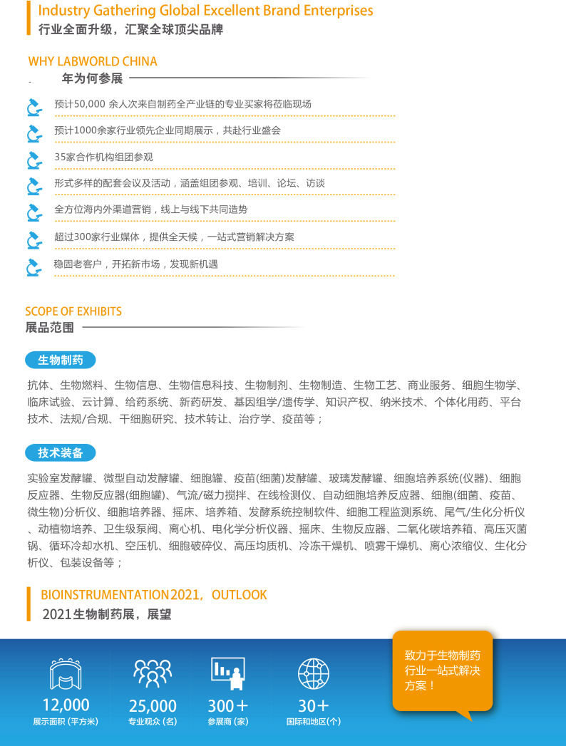 2、海量商业机会:超10,000名来自大型医药公司、生物制药、抗生素、疫苗、生物工程、生物技术公司、药品生产/研发、科研院所、临床研究公司等应用行业的精英齐聚一堂,更有来自土耳其、日本、韩国、泰国、印度、印尼等20多个国际组团交流洽谈;全球知名生物制药企业管理层与采购总监等决策者莅临现场共寻商机!