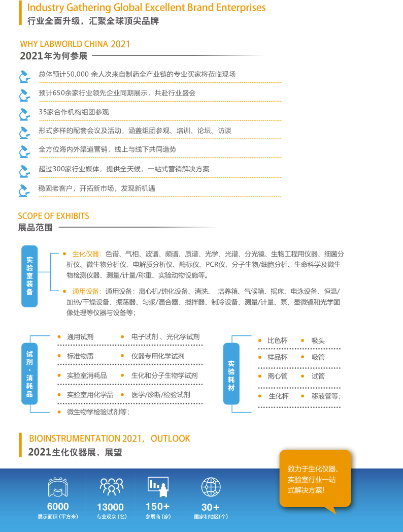 由中国生物发酵产业协会主办,上海信世展览服务有限公司承办的“2021上海国际生化仪器、实验室及试剂耗材展览会”于2021年8月25-27日在上海新国际博览中心召开,为生命科学、生物技术和相关行业搭建了一个技术交流、促进合作、扩大上下游贸易、提高品牌和企业知名度的平台。为充分利用这一平台,向上下游企业和公众展示行业新产品、新技术,赢得市场认知度及经济效益。