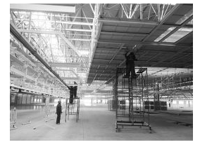 山西新能源汽车工业有限公司总装车间内,工人正在进行设备安装。