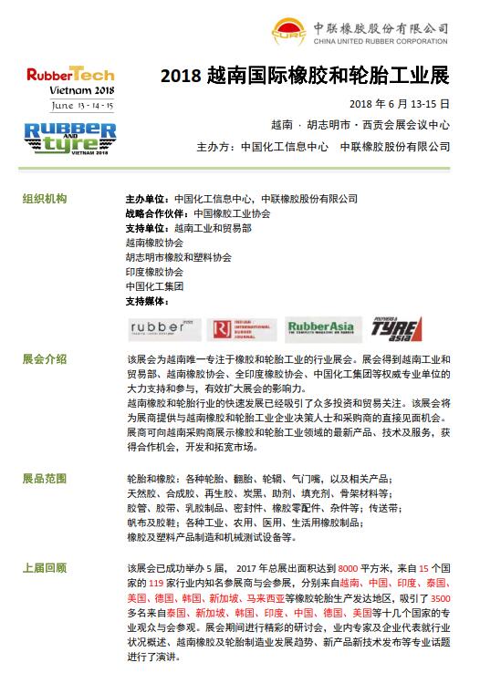 内容摘要: 展会介绍:该展会为越南唯一专注于橡胶和轮胎工业的行业展会。展会得到越南工业和贸易部、越南橡胶协会、全印度橡胶协会、中国化工集团等权威专业单位的大力支持和参与,有效……