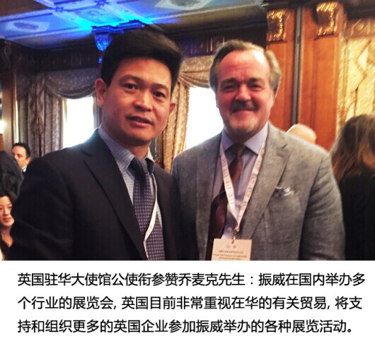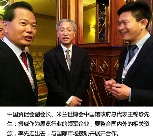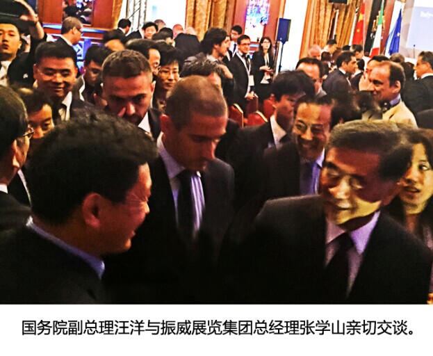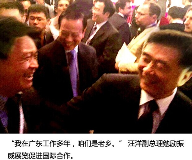 会后汪洋副总理接见了中纺集团、北京首都农业集团、振威展览集团等企业代表。当与代表们亲切握手时,听说振威展览集团总经理张学山来自广东省,汪洋副总理风趣的说,那我们算是老乡了,我在广东工作过多年,希望展会在国际交流与贸易合作中,起到桥梁和纽带作用。