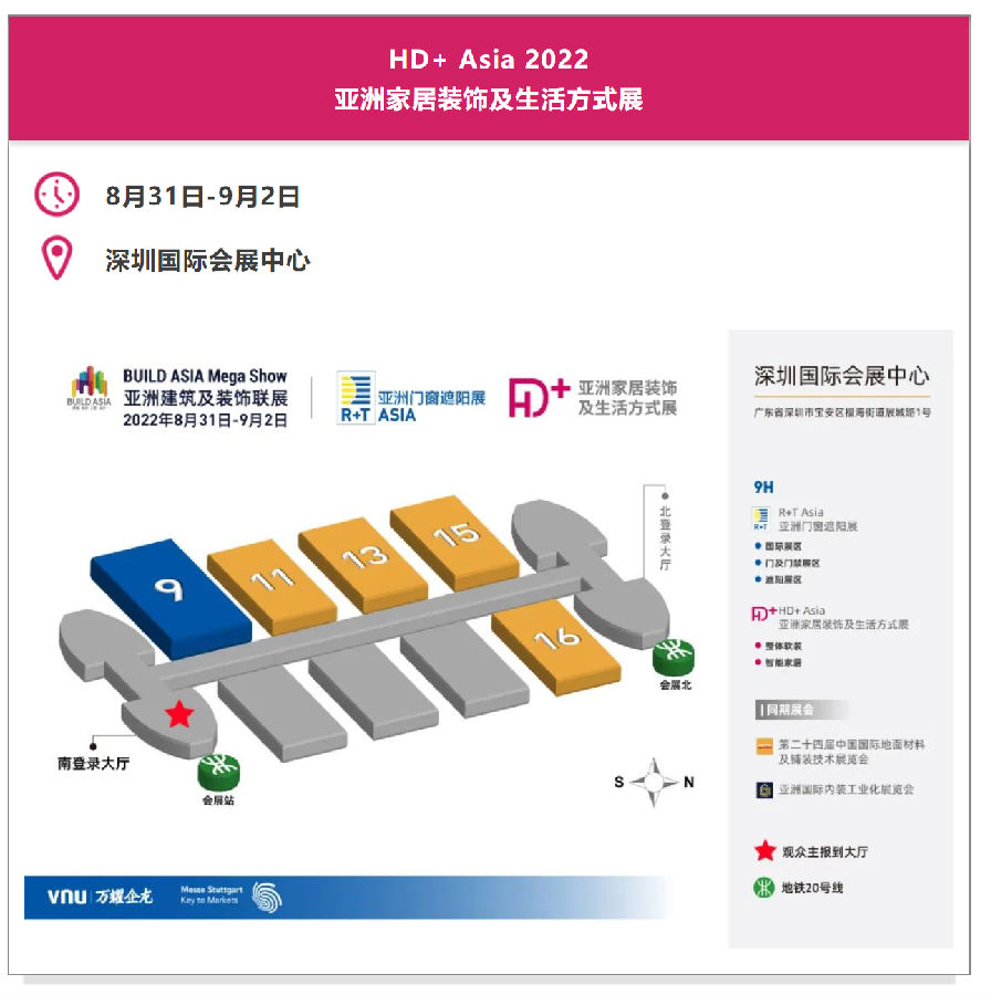 2022年8月31-9月2日,HD+ Asia 将继续携手R+T Asia亚洲门窗遮阳展及BUILD ASIA Mega Show,落户深圳国际会展中心,建装全品类八展联动开启“建装一体化”新赛道,更好的展馆条件,更多的行业整合,在满足观众一站式采购需求的同时,为展商拓宽海内外经销代理渠道,聚焦工程集采、设计及终端应用,为品牌的业务新增长及多元化发展提供更多整合营销服务。