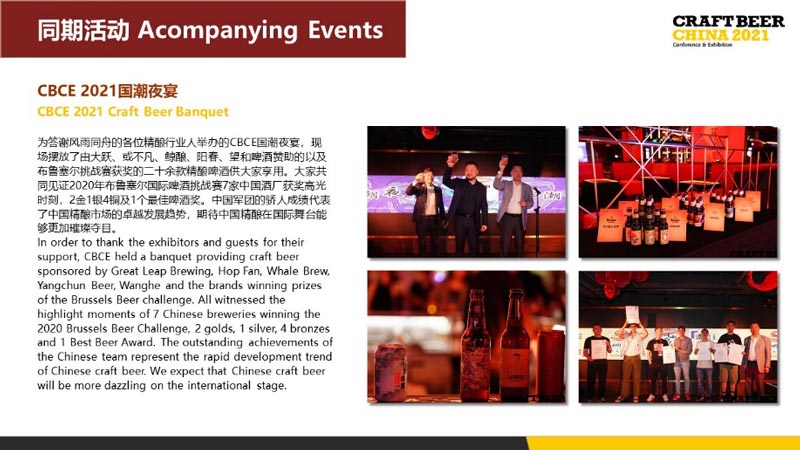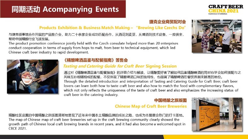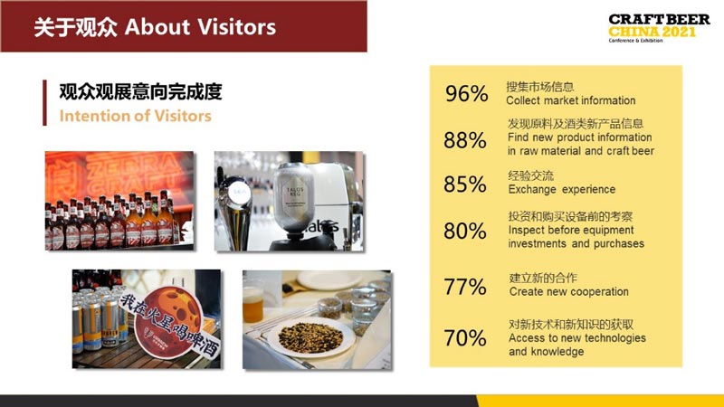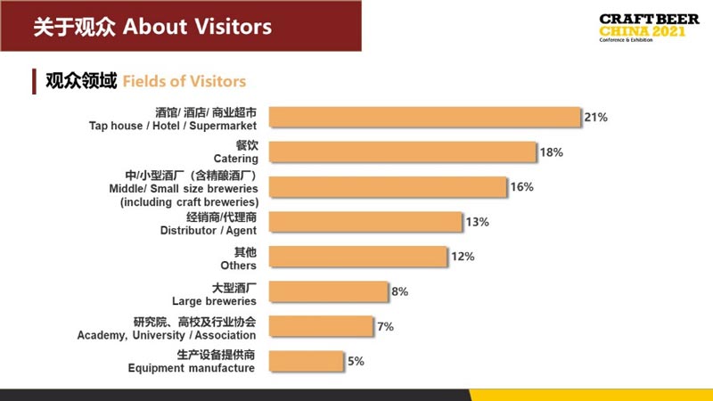 CBCE 2021的专业观众来自于国内外的酿酒师、品酒师、餐饮从业者、大型啤酒企业高管、中小啤酒厂从业者、生产商、经销商、代理商、零售商等,还包括国家主管部门、各省市啤酒协会/商会、大专院校和科研院所的食品专业专家学者、投资机构、工业设计师、品牌策划、中外媒体等。