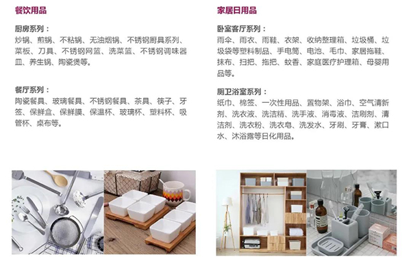 卧室客厅系列:雨伞、雨衣、雨鞋、衣架、收纳整理箱、垃圾桶、垃圾袋等塑料制品、手电筒、电池、毛巾、家居拖鞋、抹布、扫把、拖把、蚊香、家庭医疗护理箱、母婴用品等。