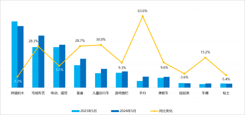 从销售均价来看,2024年5月同比增长的玩具主要品类有儿童自行车(20.5%)、毛绒布艺(11.8%)、电动遥控玩具(5.4%)和滑板车(2.8%)。婴童用品中除电动童车外,销售均价均同比增长,其中增幅前三的品类分别为儿童安全座椅、餐椅和奶瓶,分别增长20.8%、11.6%和5.2%。