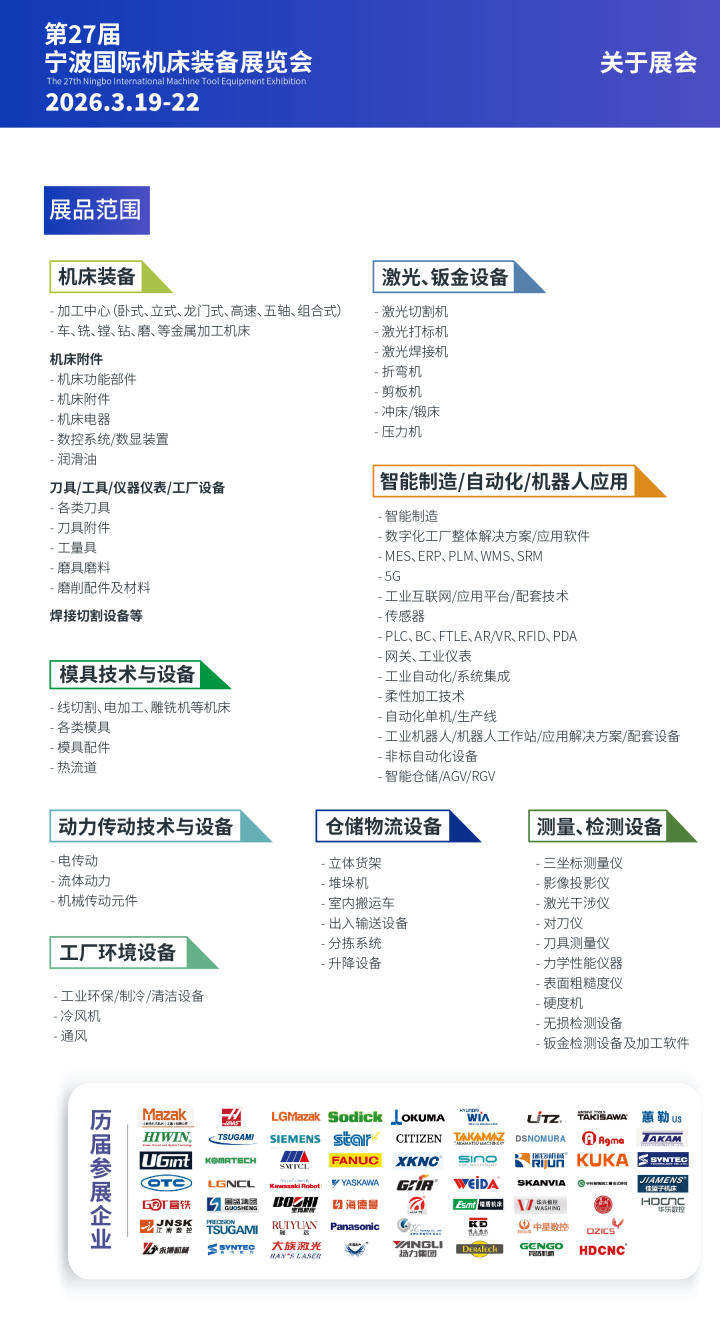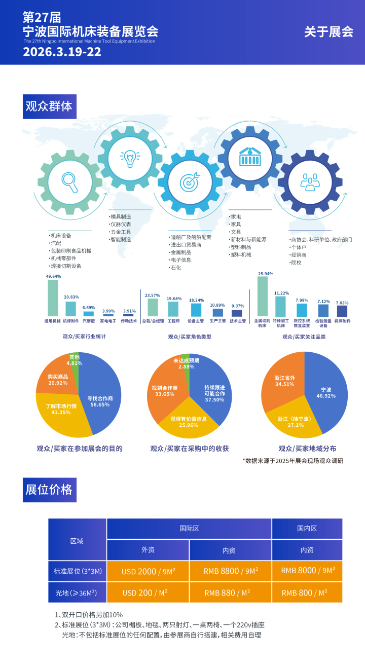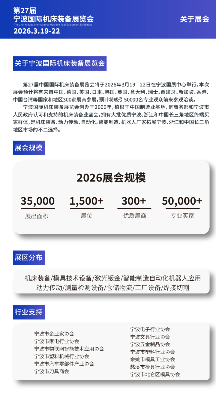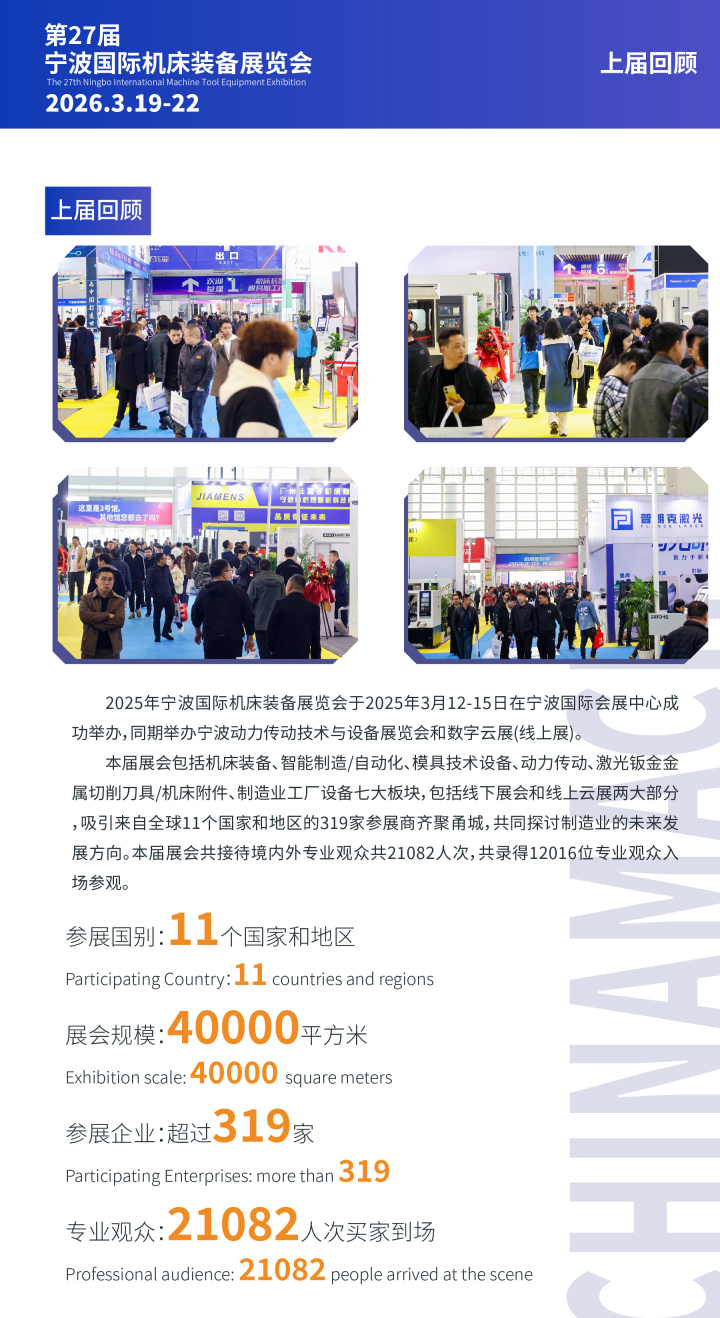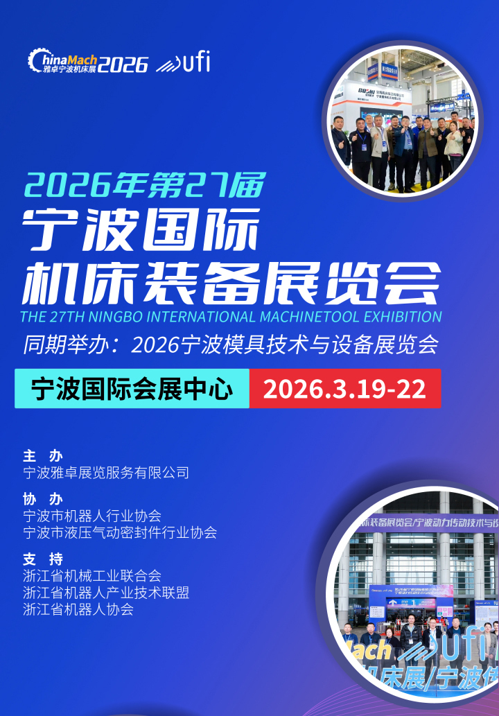 第27届中国国际机床装备展览会将于2026年3月19—22日在宁波国展中心举行。本次展会预计将有来自中国、德国、美国、日本、韩国、英国、意大利、瑞士、西班牙、新加坡、香港、中国台湾等国家和地区300家展商参展,预计将吸引50000名专业观众前来参观洽谈。宁波国际机床装备展览会创办于2000年,植根于中国制造业基地,是商务部和宁波市人民政府认可和支持的机床装备业盛会,拥有大批优质宁波、浙江和中国长三角地区终端买家群体,是机床装备、动力传动、自动化、智能制造、机器人厂家拓展宁波、浙江和中国长三角地区市场的不二选择。
