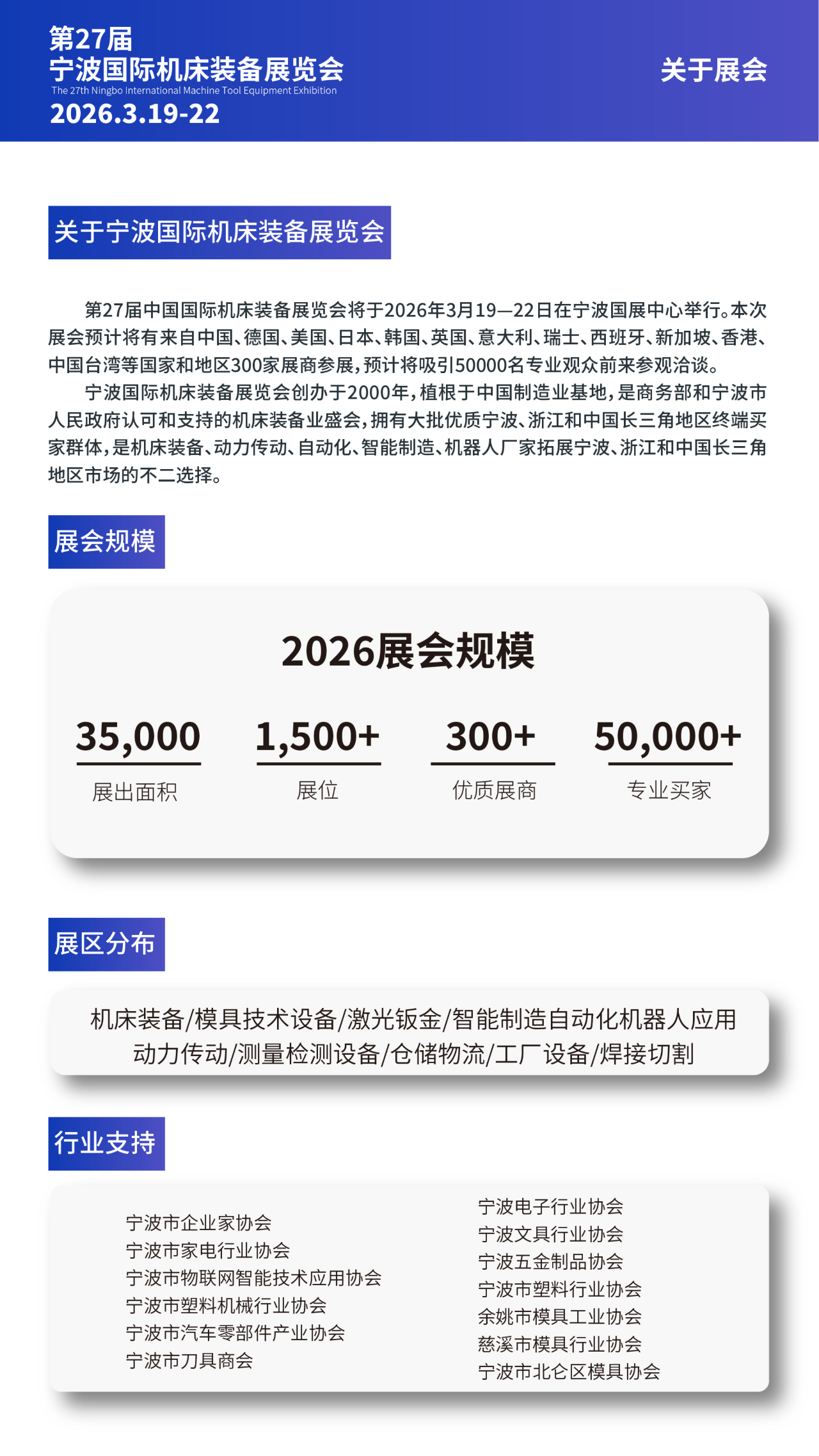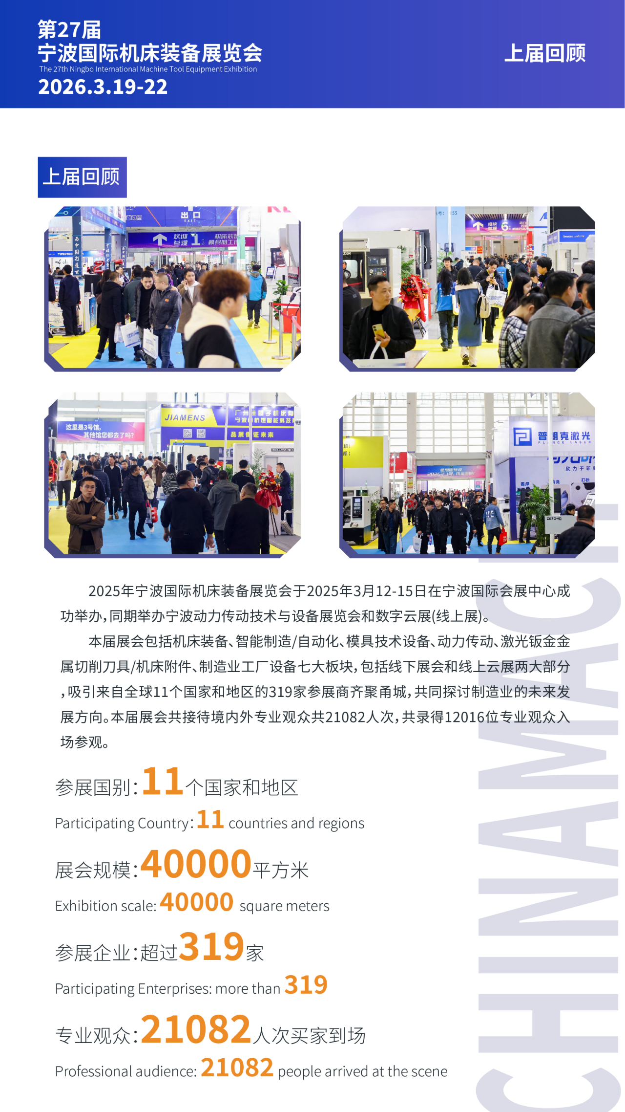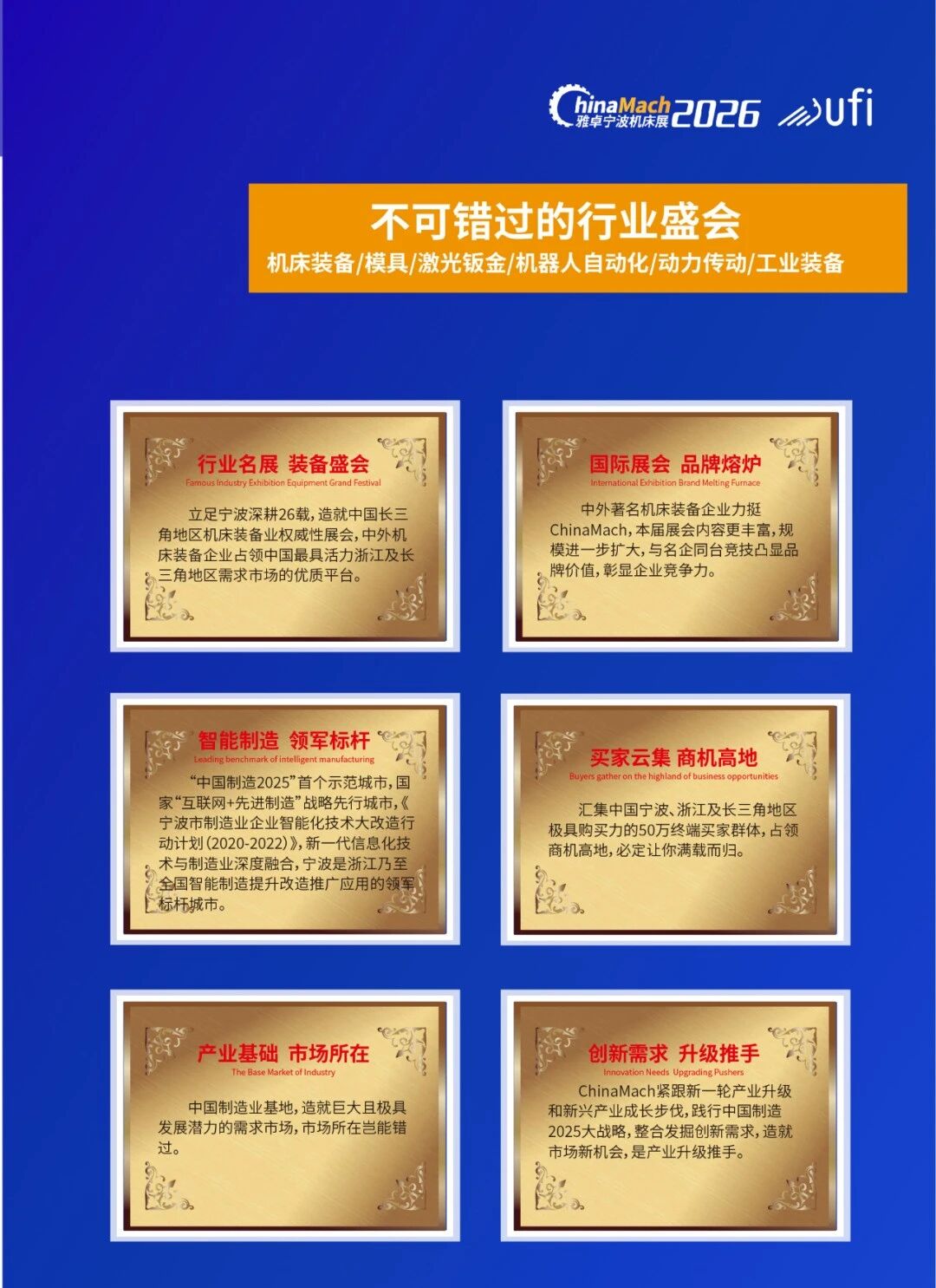 宁波国际机床装备展览会创办于2000年,植根于中国制造业基地,是商务部和宁波市人民政府认可和支持的机床装备业盛会,拥有大批优质宁波、浙江和中国长三角地区终端买家群体,是机床装备、动力传动、自动化、智能制造、机器人厂家拓展宁波、浙江和中国长三角地区市场的不二选择。