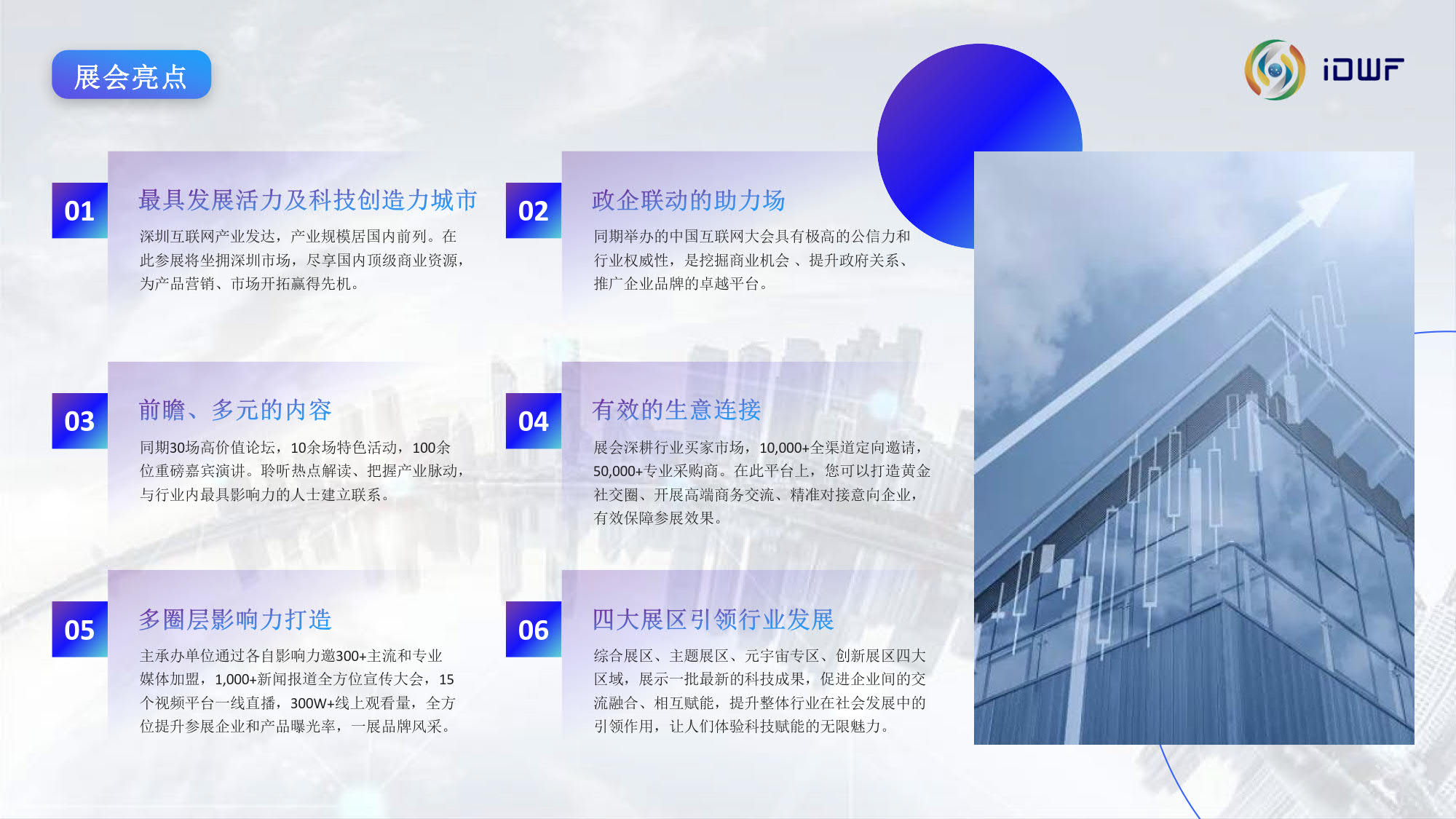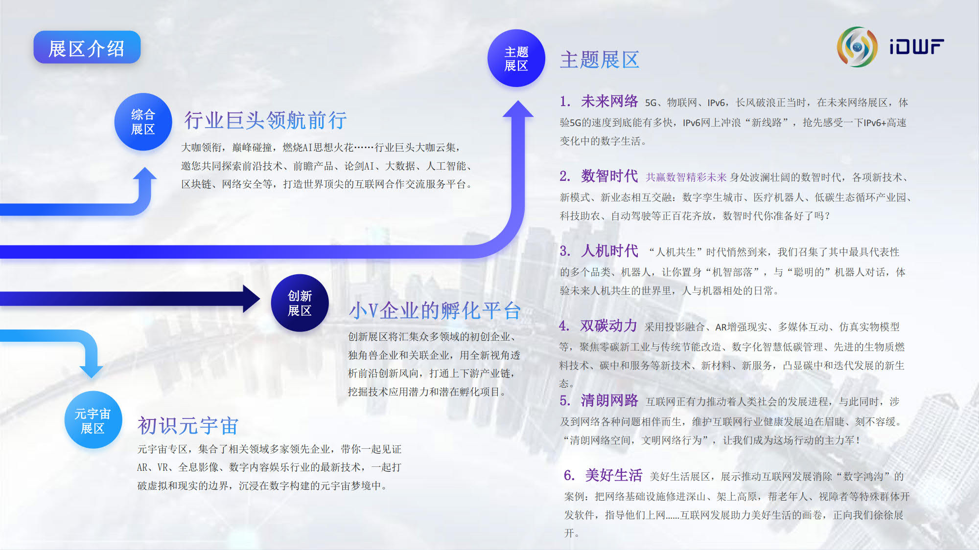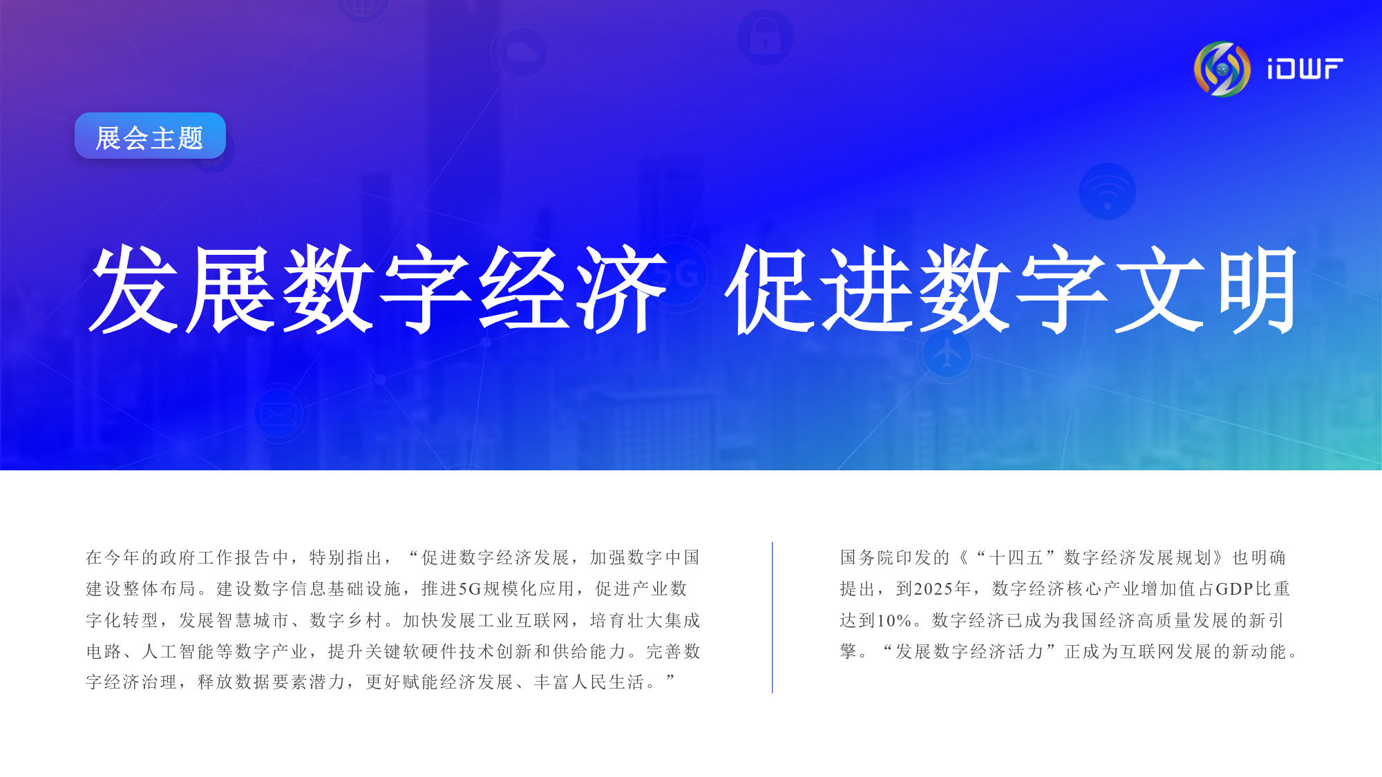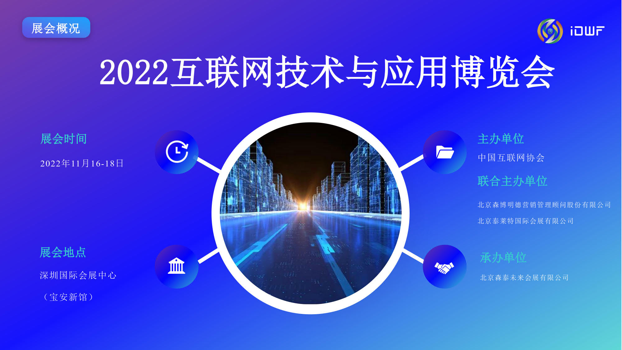 互联网技术与应用博览会(iDWF)由中国互联网协会主办。作为引领新一代数 字景业态的平台,国内首个互联网产业数字化综合类展会,iDWF通过全面链接互联网上下游最完备的产业链资源,全场景展示最前沿、最领先的互联 网技术与应用,搭建高效的行业沟通、与政学研企业内影响力人士建立 联系的桥梁,打造一站式采购交易阵地,以“互联网赋能千行百业”为愿景,推动企业在新一代互联网时代高质量发展。