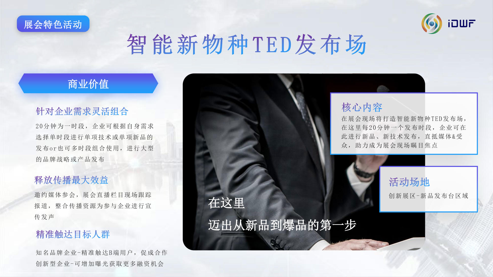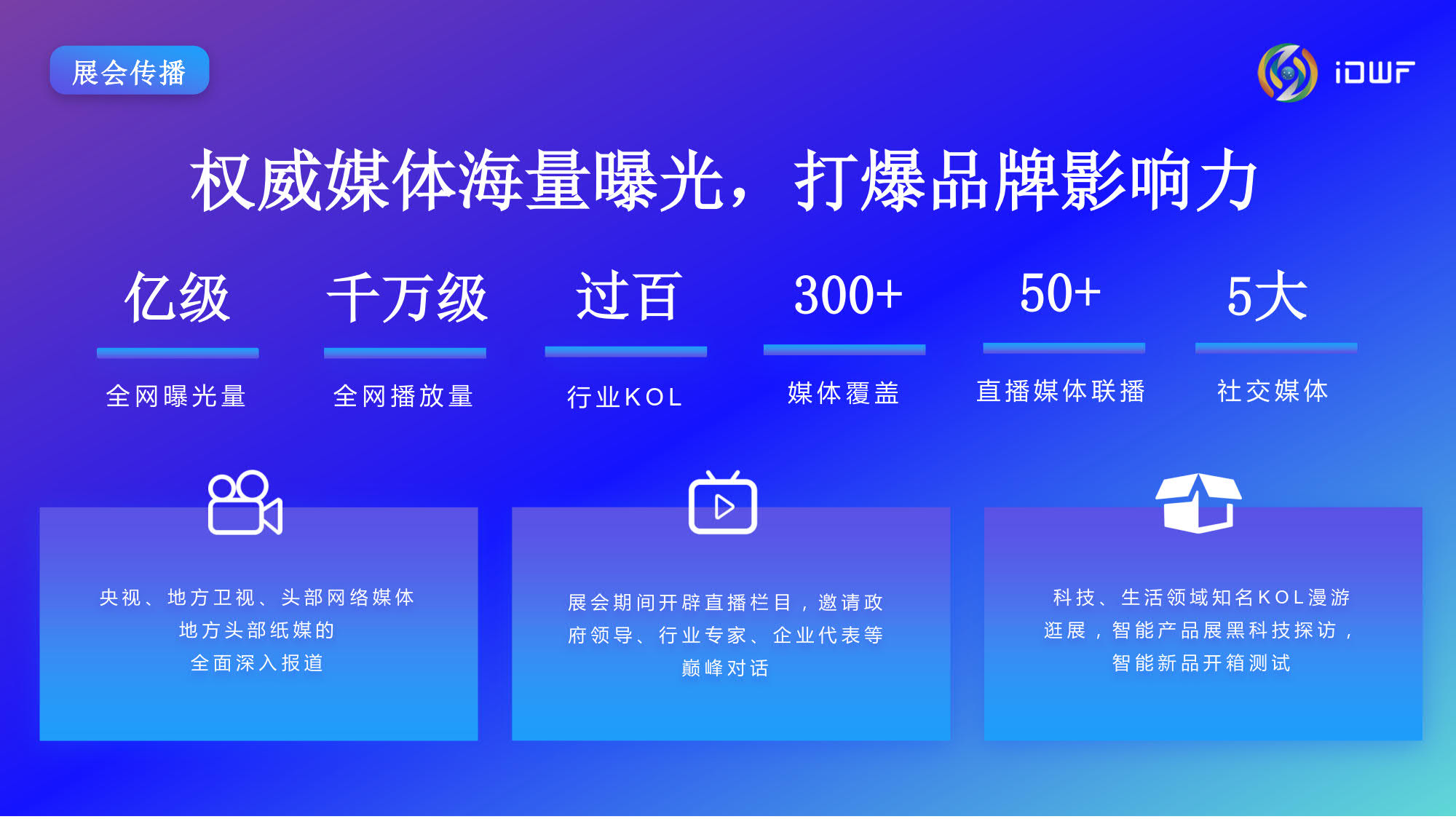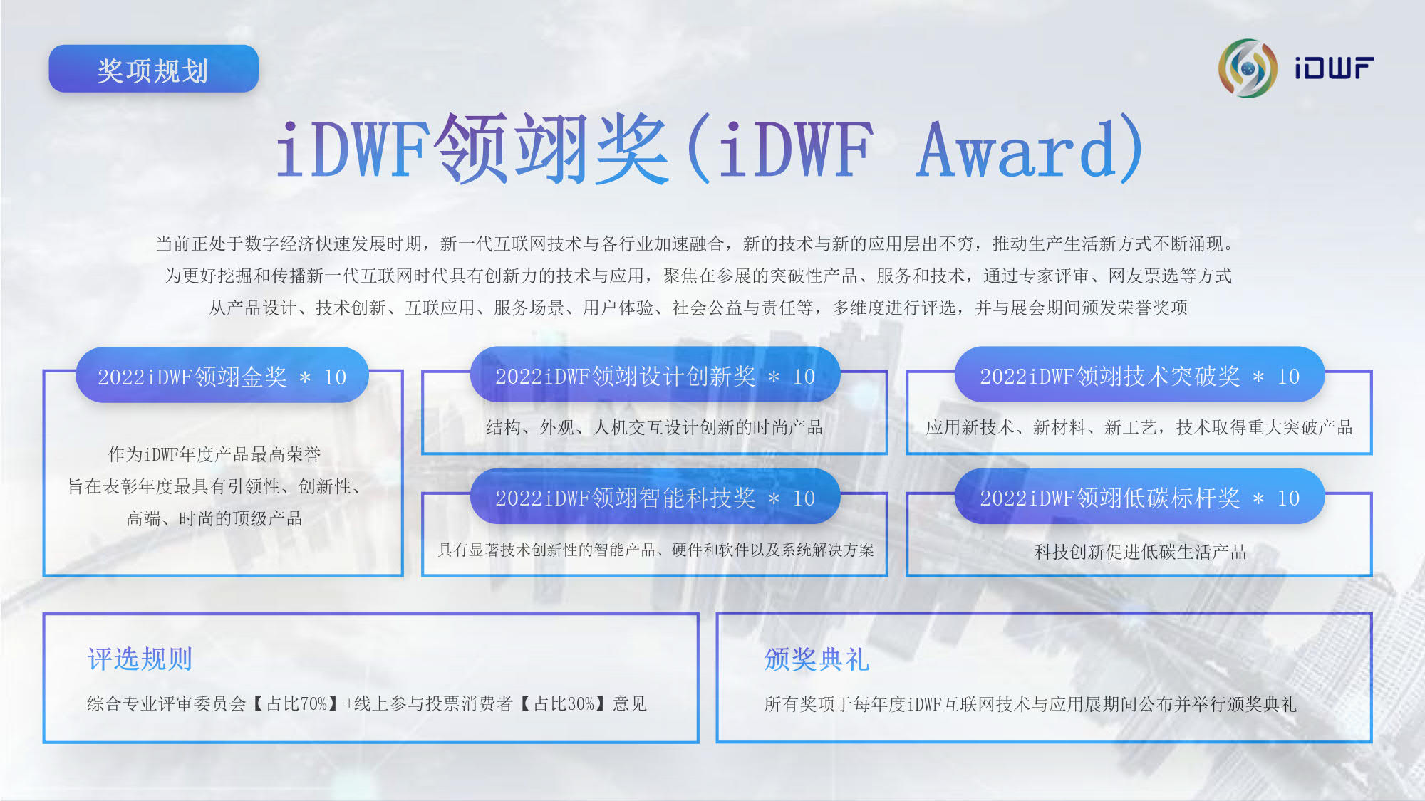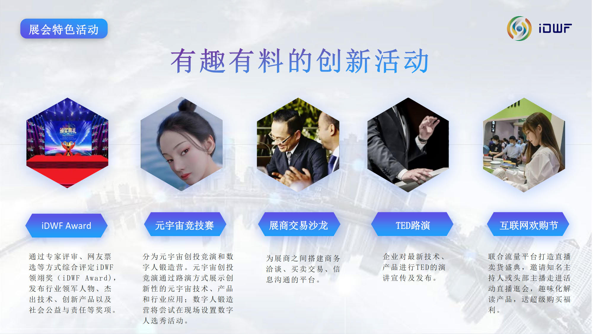 互联网技术与应用博览会(iDWF)由中国互联网协会主办。作为引领新一代数 字景业态的平台,国内首个互联网产业数字化综合类展会,iDWF通过全面链接互联网上下游最完备的产业链资源,全场景展示最前沿、最领先的互联 网技术与应用,搭建高效的行业沟通、与政学研企业内影响力人士建立 联系的桥梁,打造一站式采购交易阵地,以“互联网赋能千行百业”为愿景,推动企业在新一代互联网时代高质量发展。