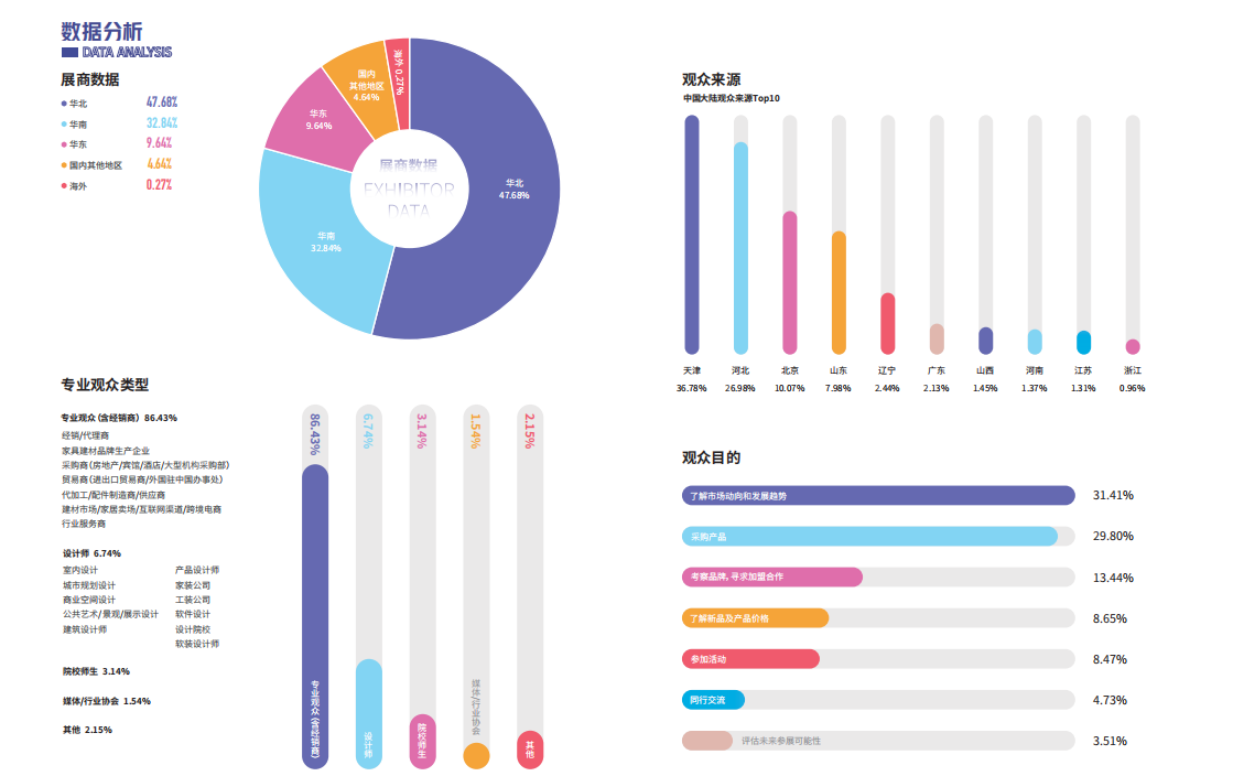 中国家博会对不同题材、不同行业、不同渠道的观众进行个性化精准邀约,每届中国家博会(广州)、中国家博会(上海)均有来自全球超150个国家和地区,超过10万名国际进出口商、经销商、零售商、品牌连锁店、设计师、建筑师、房地产商等专业观众到会。预计中国家博会(天津)会有10万名家居卖场经销商,设计师、行业代理商、行业组织、行业工厂等专业观众到会。