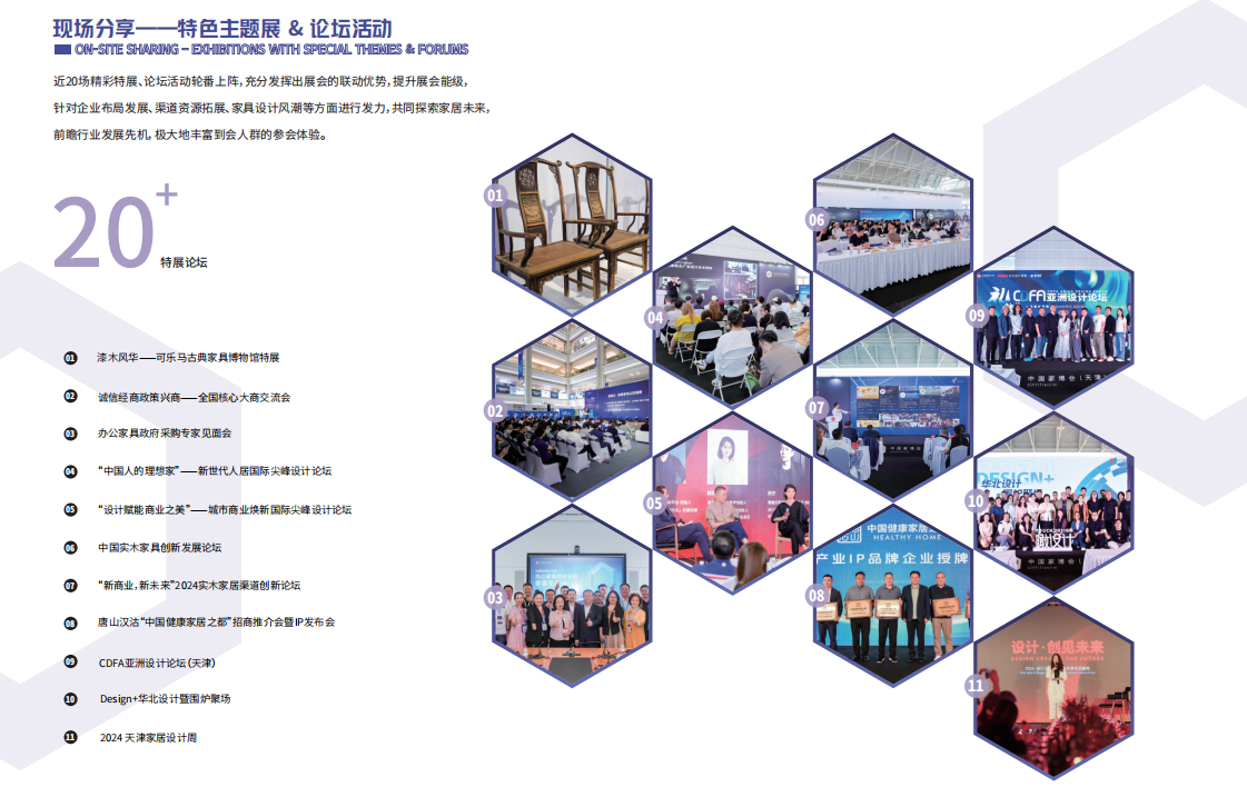 同期举办多场精彩纷呈的设计展示、沙龙论坛、行业盛典、发布活动等,包括TOP实木品牌企业家峰会、实木选品大会、设计品鉴馆、红星美凯龙大会、木材产业大会等。助力展商和观众掌握最新行业动态,把握产业趋势脉搏,为行业提供一场大家居盛宴。