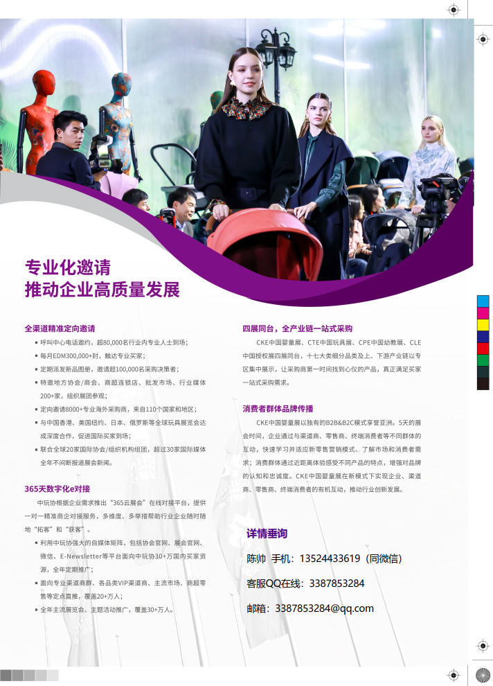 CKE婴童展是展会,更是行业盛会,除提供优质展位推广外,还拥有行业大会、行业晚会、行业表彰、风车奖、趋势发布、校企对接、精益培训,网站报导、BtoB微信/BtoC微信宣传等业务。