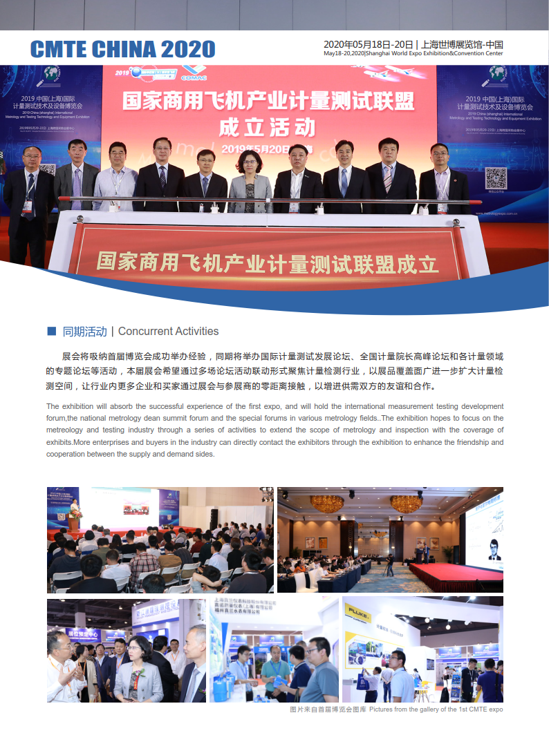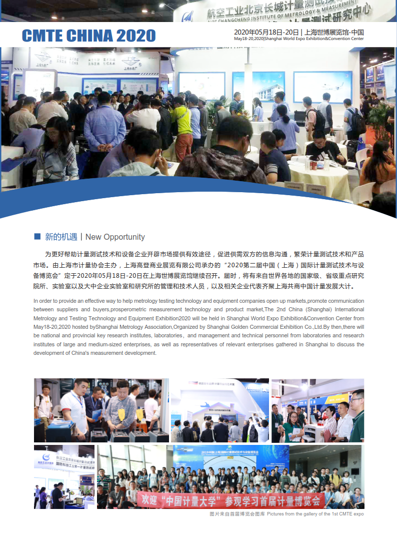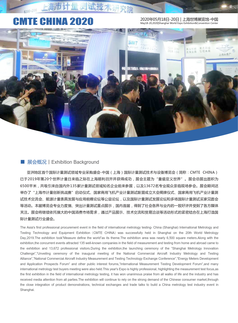 亚洲地区首个国际计量测试领域专业采购盛会-中国(上海)国际计量测试技术与设备博览会(简称:CMTE CHINA) 已于2019年第20个世界计量日来临之际在上海顺利召开并获得成功,展会主题为“量值定义世界”。展会总展出面积为 6500平米,共吸引来自国内外135家计量测试领域知名企业前来参展,以及13672名专业观众亲临现场参会。展会期间还 举办了“上海市计量创新挑战赛”启动仪式、国家商用飞机产业计量测试联盟成立大会揭牌仪式、国家商用飞机产业计量测 试技术交流会、能源计量表具发展与应用前瞻论坛等公益论坛,以及国际计量测试发展论坛和多场国际计量测试买家见面会 等活动。本届博览会专业力度强、突出计量测试重点展示,国内首届,得到了社会各界与业内的一致好评并受到了各方媒体 关注。展会将继续依托强大的中国消费市场需求,通过产品展示、技术交流和贸易洽谈等活动形式的紧密结合在上海打造国 际计量测试行业盛会。