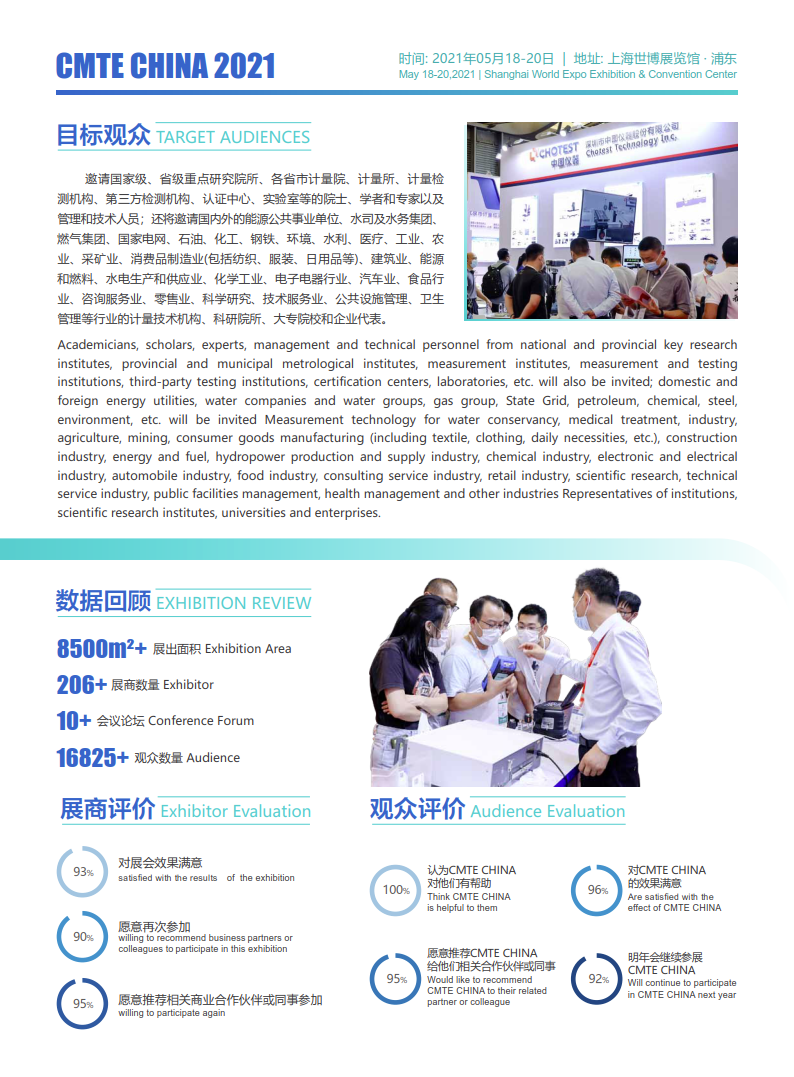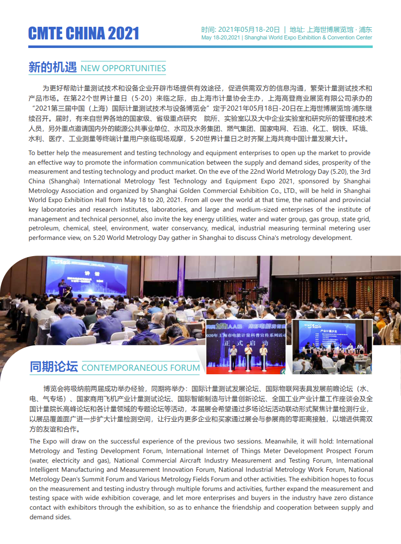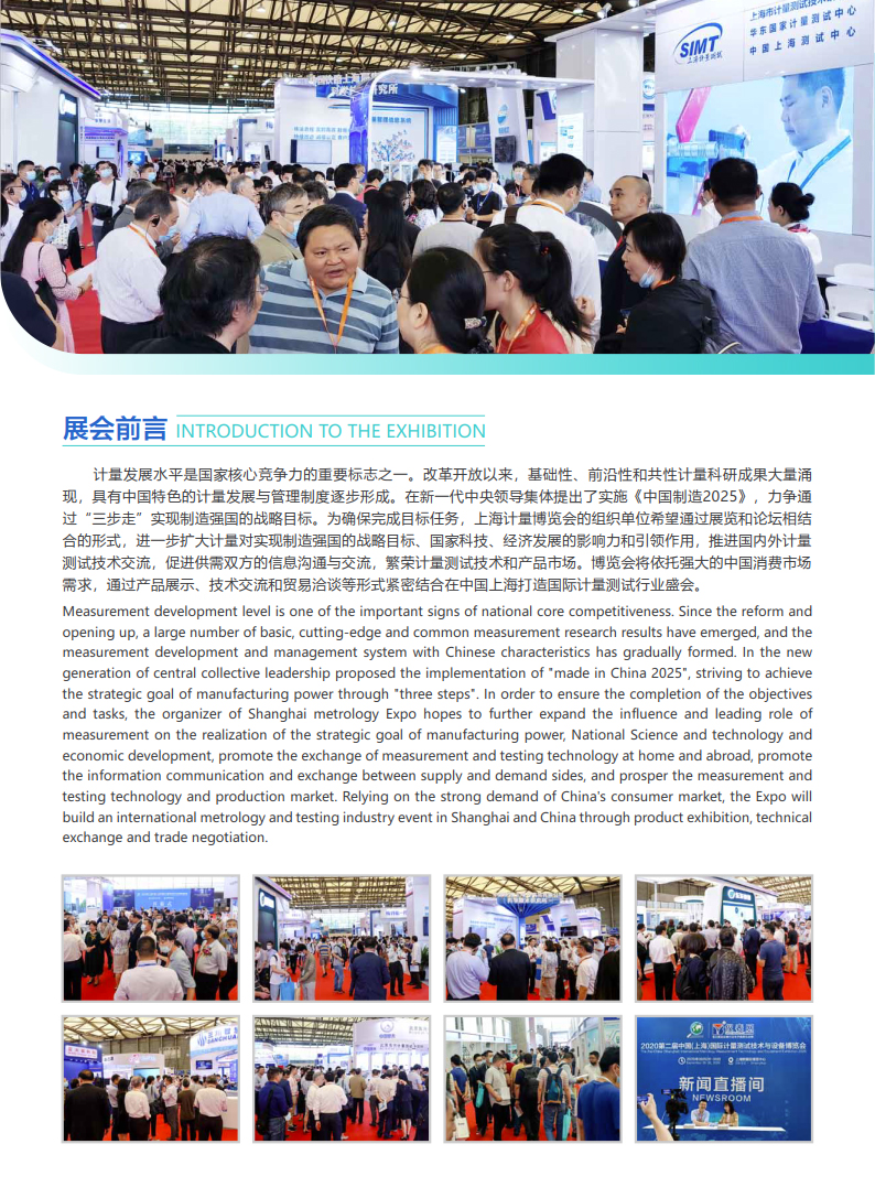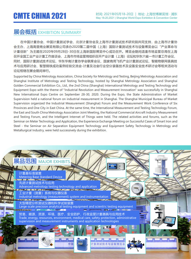 为更好帮助计量测试技术和设备企业开辟市场提供有效途径,促进供需双方的信息沟通,繁荣计量测试技术和 产品市场。在第22个世界计量日(5·20)来临之际,由上海市计量协会主办,上海高登商业展览有限公司承办的 “2021第三届中国(上海)国际计量测试技术与设备博览会”定于2021年05月18日-20日在上海世博展览馆·浦东继 续召开。届时,有来自世界各地的国家级、省级重点研究 院所、实验室以及大中企业实验室和研究所的管理和技术 人员,另外重点邀请国内外的能源公共事业单位、水司及水务集团、燃气集团、国家电网、石油、化工、钢铁、环境、 水利、医疗、工业测量等终端计量用户亲临现场观摩,5·20世界计量日之时齐聚上海共商中国计量发展大计。