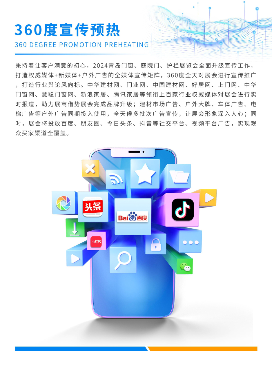 基于新时代下门窗、庭院大门、护栏未来的市场需求导向,为促进门窗、庭院大门、护栏行业新产品、新工艺及新装备的推广应用与经贸交流,由海名国际会展集团主办的2023青岛国际门窗、庭院大门、护栏展览会将于2024年7月30日-8月1日在红岛国际会议展览中心隆重举办。展会专注于整合门窗、庭院大门、护栏行业,重点打造集品牌展示、技术交流、贸易合作、宣传推广等功能于一体的高效优质会展平台。