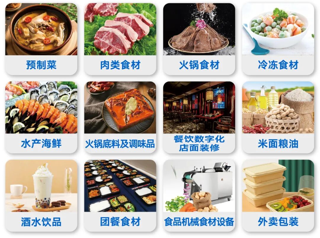 展品将更加全面的涵盖餐饮全产业供应链各环节,包括预制菜、肉类食材、火锅食材、冷冻食材、水产海鲜、火锅底料及调味品、酒水饮品、团餐食材、米面粮油、外面包装、食品机械食材设备、店面装修设计。倾力打造餐饮行业供需双方一站式交易交流平台。
