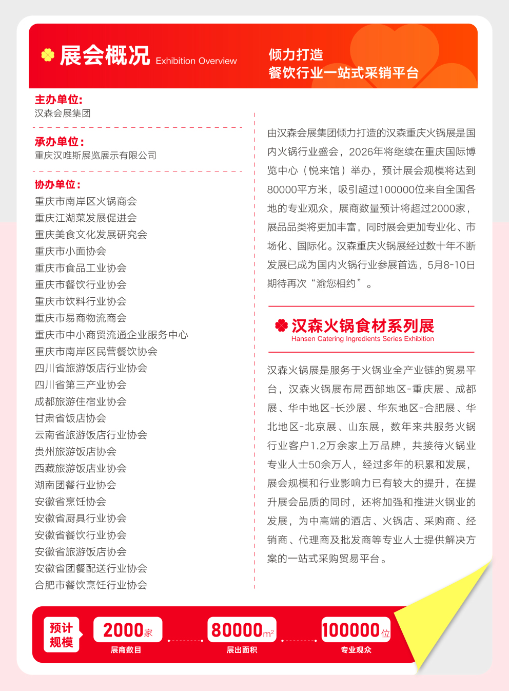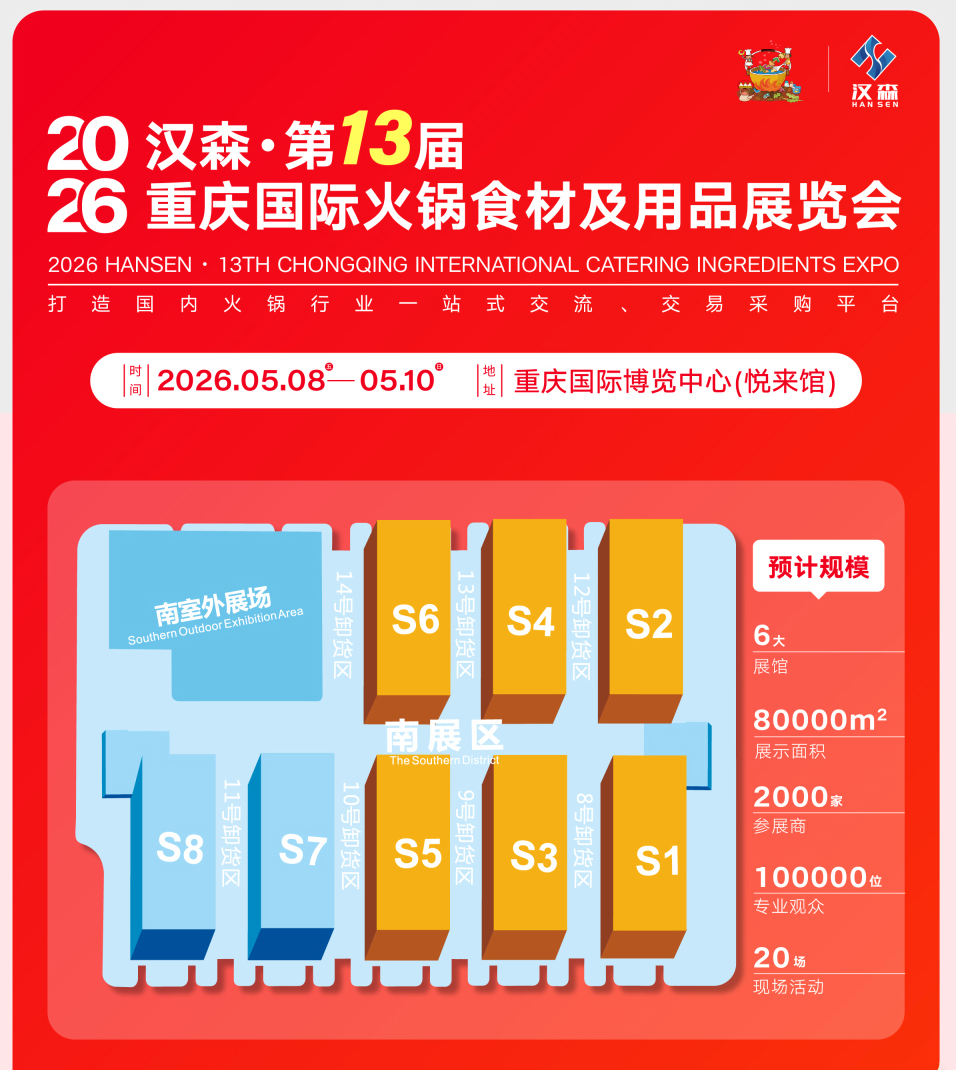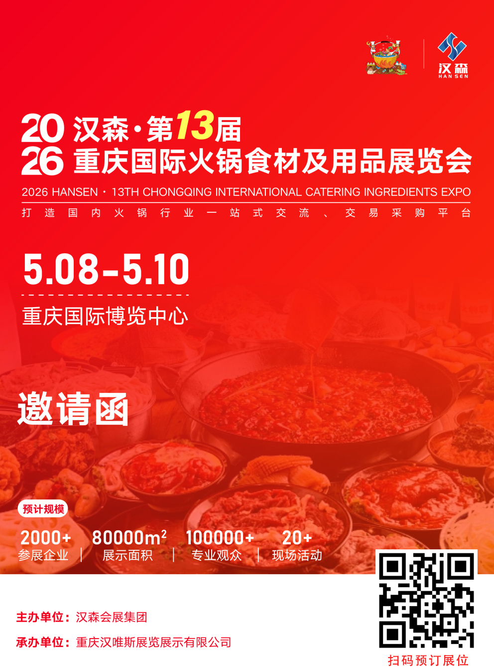 汉森重庆火锅展已成功举办了12届,致力为火锅餐饮同行打造一站式采购解决方案,是国内火锅餐饮行业一站式交流、交易采购平台。已成为国内餐饮行业规模最大、最具影响力的博览会之一。2026年将继续在重庆国际博览中心(悦来馆)举办,预计展会规模将达到近80000平方米,预计吸引超过100000位来自全国各地的专业观众展商数量预计将超过2000家,展品品类将更加丰富,同时展会更加专业化、市场化、国际化。