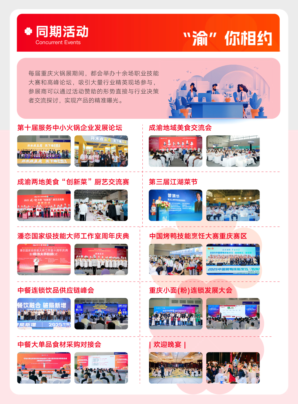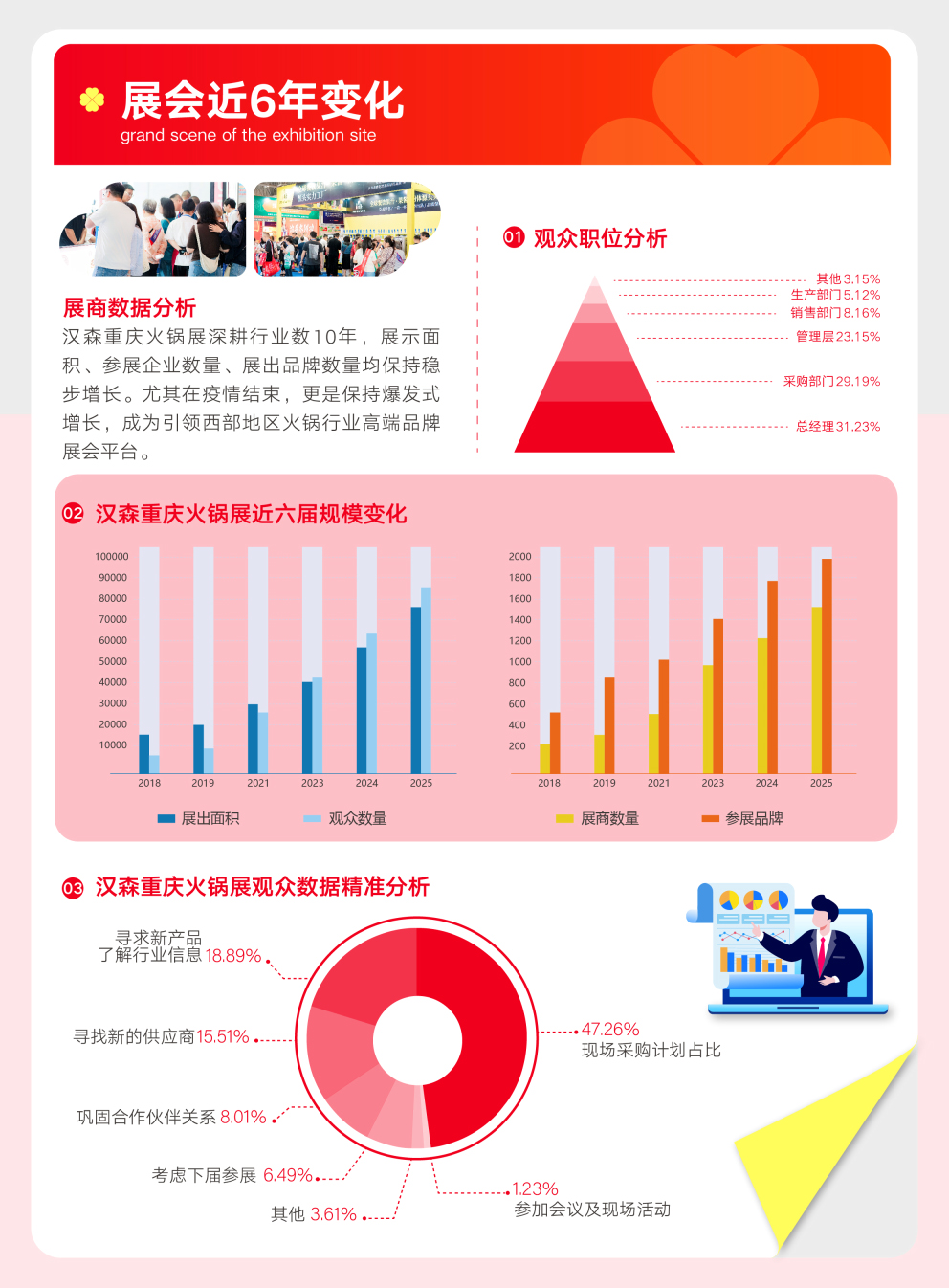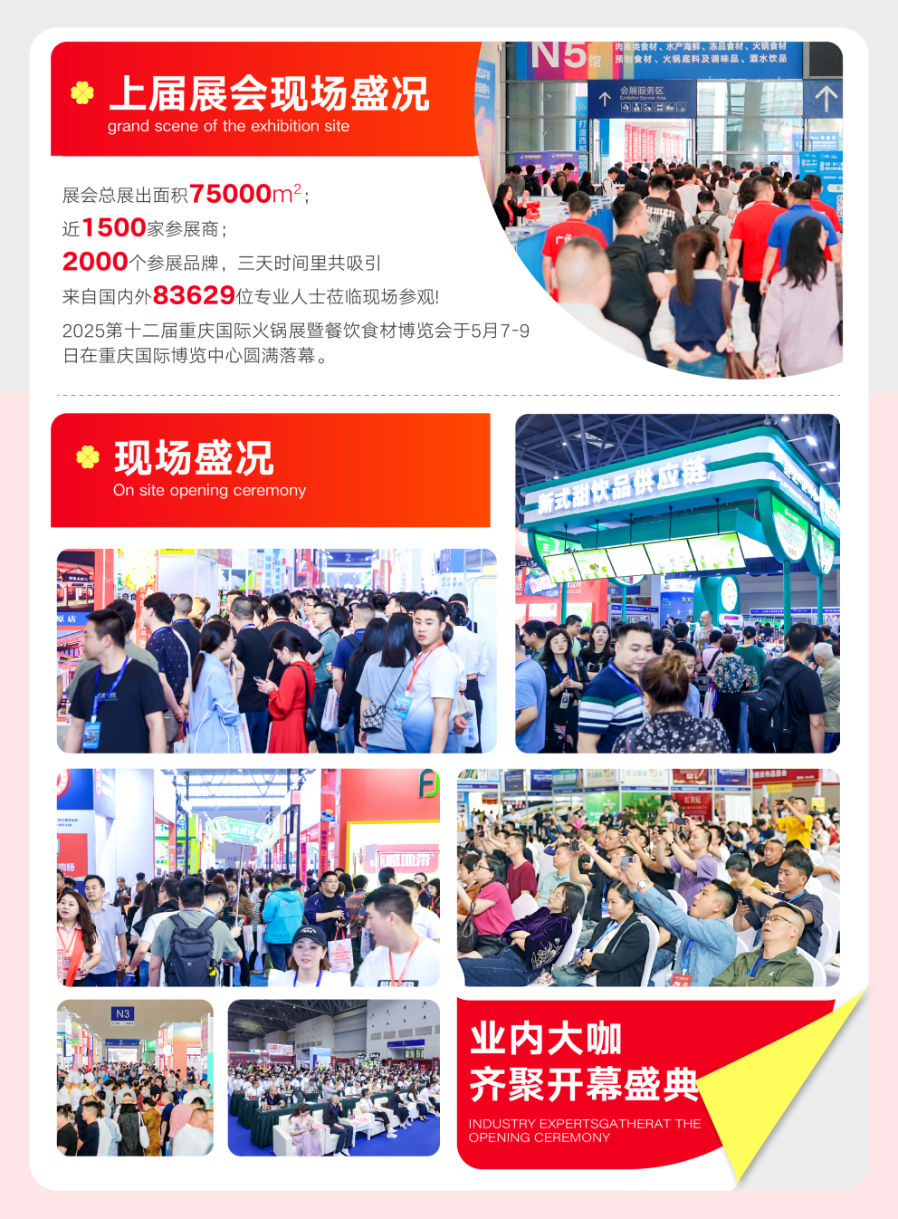 汉森重庆火锅展已成功举办了12届,致力为火锅餐饮同行打造一站式采购解决方案,是国内火锅餐饮行业一站式交流、交易采购平台。已成为国内餐饮行业规模最大、最具影响力的博览会之一。2026年将继续在重庆国际博览中心(悦来馆)举办,预计展会规模将达到近80000平方米,预计吸引超过100000位来自全国各地的专业观众展商数量预计将超过2000家,展品品类将更加丰富,同时展会更加专业化、市场化、国际化。