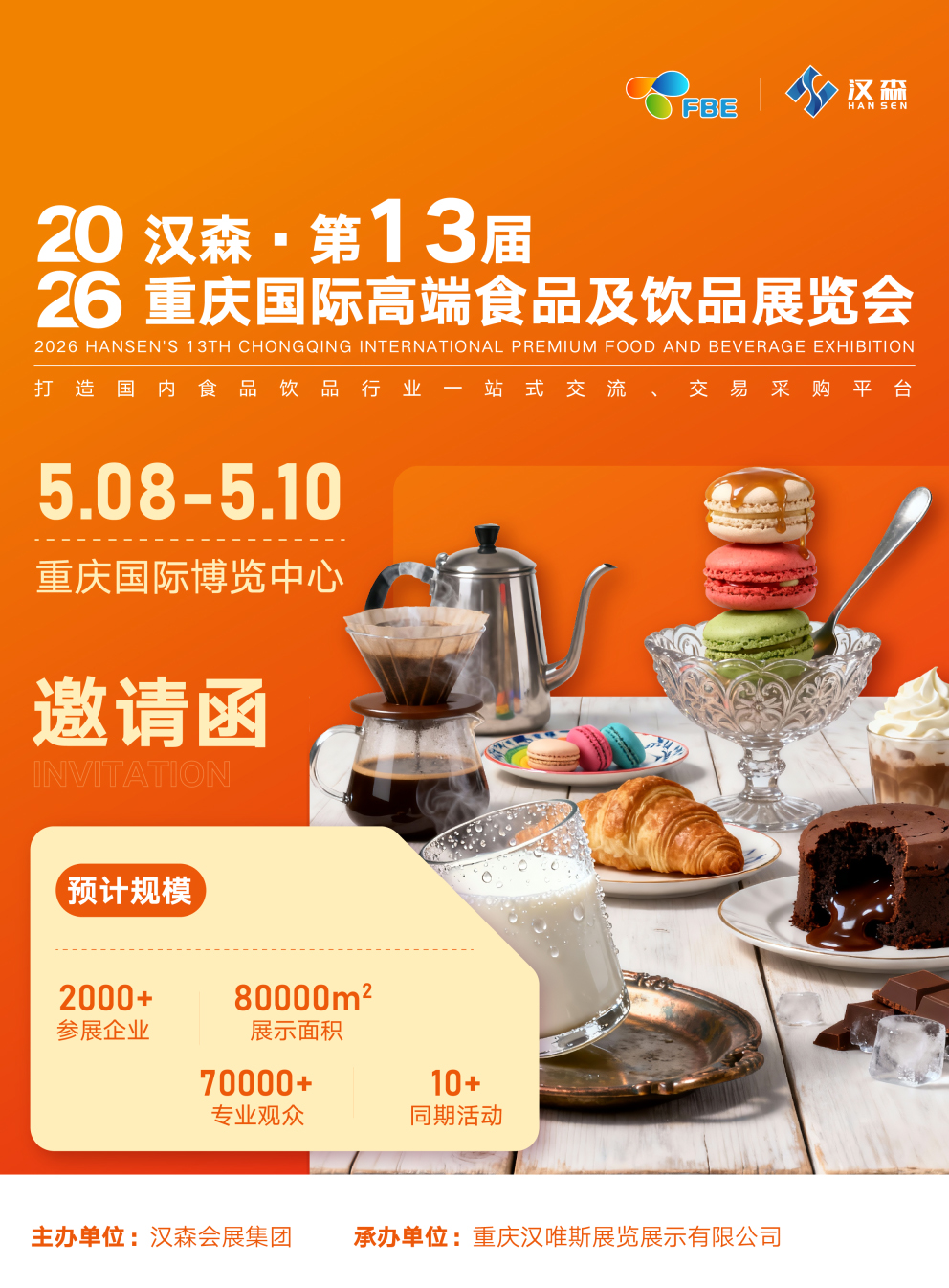 由多方权威机构联手共同打造的2026第13届重庆国际高端食品及饮品展览会将于2026年5月8-10日在重庆国际博览中心(悦来馆)再次上演。将携手国内外食品品牌,带来行业创新成果,关注新兴业态,开辟新的市场渠道,还将结合丰富多元的创投互动和行业交流活动,形成品牌高效展示与资源高效整合,为粮油及调味品行业业内人士传递前沿资讯、发展趋势报告、大咖经营思维、盈利秘笈等精彩内容,为食品行业带来一场别开生面的贸易盛会。