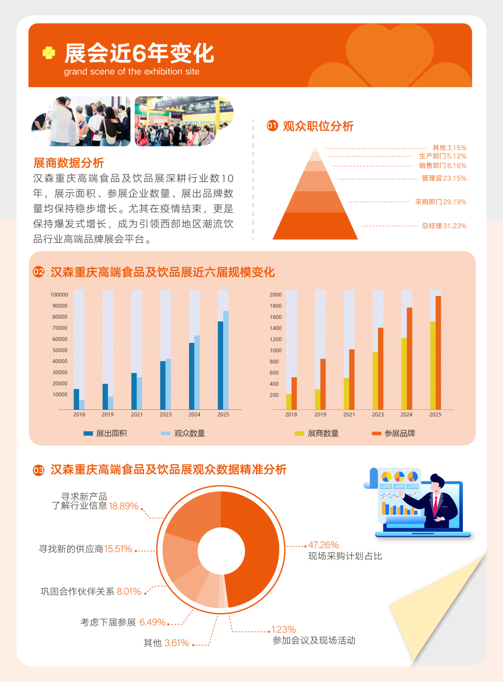 重庆是我国历史文化名城,有3000余年历史,亦是巴渝文化的发祥地。在新经济总量城市排名中,重庆位列中西部城市第一名,全国第五名,新经济竞争力得分远超成都、杭州、武汉、天津、南京等“新一线城市”。从发展潜力和动力来看,重庆以其优异的产业基础、领先的新经济发展政策环境、在“一带一路”、“长江经济带”等国家战略的大力推动下,重庆将成为未来全国城市新经济发展的中心、策源地和新引擎。重庆作为中国四大直辖市之一,不仅是人口超3000万的超大城市,更是以“美食之都”享誉全国。庞大的本地人口基数叠加年均超5亿人次的游客流量,形成稳定的终端消费市场,日均消费频次领先全国。庞大的基数背后,是餐饮业、社区商超、食品加工等企业的密集需求。随着消费升级和城市经济活力持续释放,重庆食品市场展现出强劲潜力。作为西部食品行业风向标的重庆高端食品及饮品展已成功举办12届,是目前国内综合食品行业盛会,上届展会总展出面积57500平方米,共吸引了1200家展商与65829位专业观众参与此次盛会。