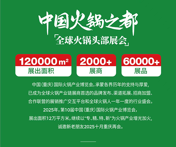 第十届中国(重庆)国际火锅产业博览会将于2025年10月17-19日在重庆国际博览中心举行。本次展会展出面积12万平方米,继续以“专、精、特、新”为火锅产业增光添彩。