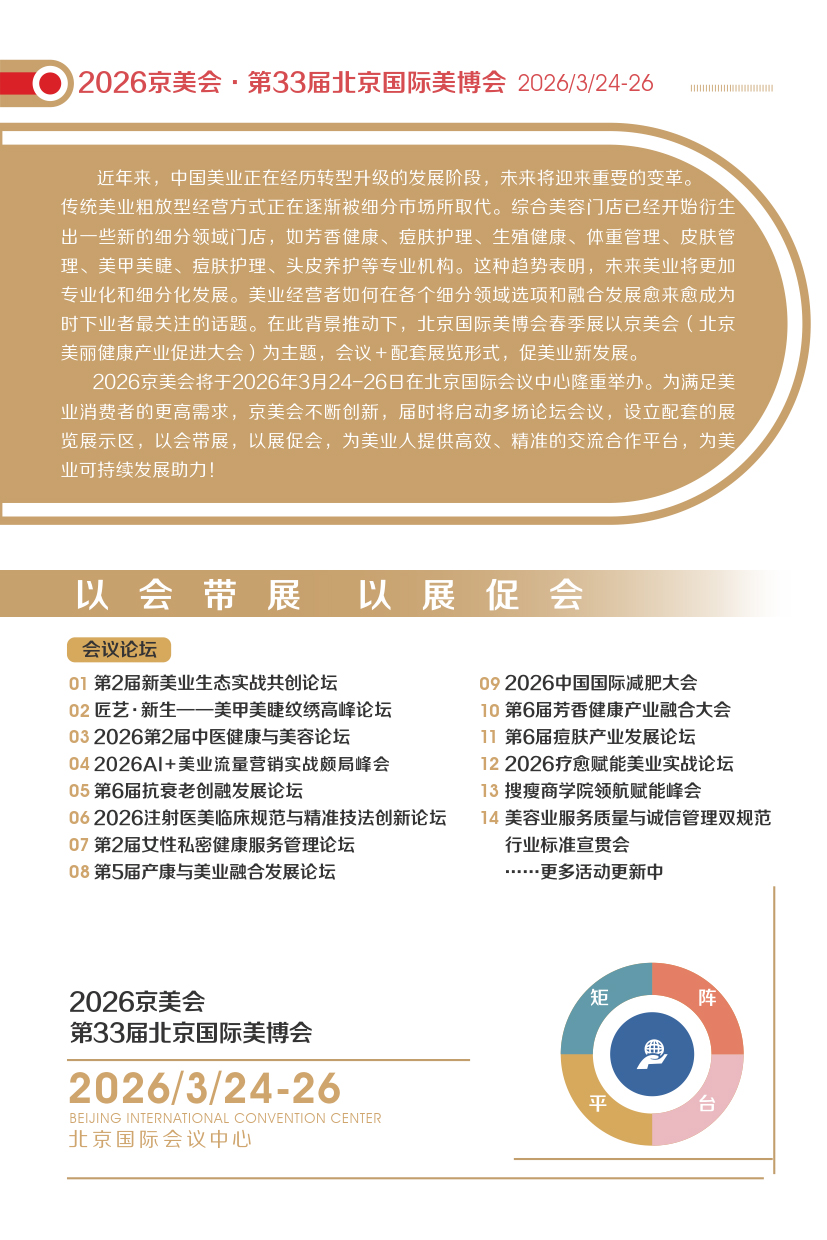 2026京美会将于2026年3月24-26日在北京国际会议中心隆重举办。为满足美业消费者的更高需求,京美会不断创新,届时将启动多场论坛会议,设立配套的展览展示区,以会带展,以展促会,为美业人提供高效、精准的交流合作平台,为美业可持续发展助力!