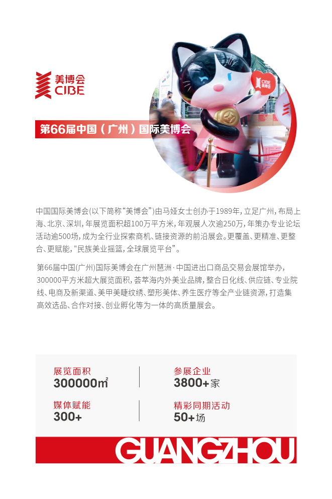 第66届中国(广州)国际美博会在广州琶洲·中国进出口商品交易会展馆举办,300000平方米超大展览面积,荟萃海内外美业品牌,整合日化线、供应链、专业院线、电商及新渠道、美甲美睫纹绣、塑形美体、养生医疗等全产业链资源,打造集高效选品、合作对接、创业孵化等为一体的高质量展会。