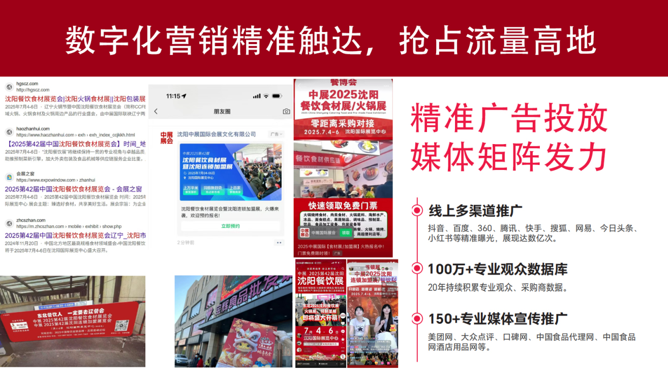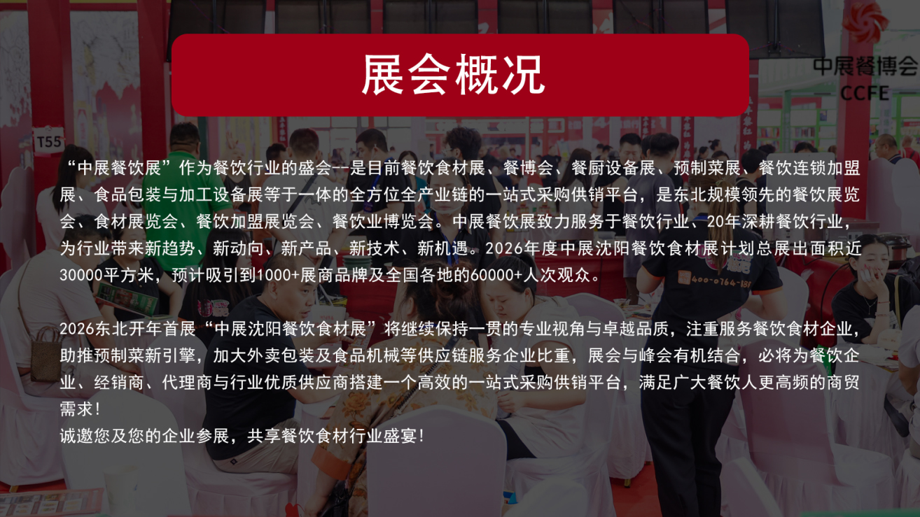 “中展•沈阳餐饮展”作为餐饮行业的盛会——是目前餐饮食材展、餐博会、餐厨设备展、预制菜展、餐饮连锁加盟展、食品包装与加工设备展等于一体的全方位全产业链的一站式采购供销平台,是东北规模领先的餐饮展览会、食材展览会、餐饮加盟展览会、餐饮业博览会。沈阳餐饮展致力服务于餐饮行业、20年深耕餐饮行业,为行业带来新趋势、新动向、新产品、新技术、新机遇。2026年度沈阳餐饮展计划总展出面积近30000平方米,预计吸引到1000+展商及全国各地的50000+人次观众。
