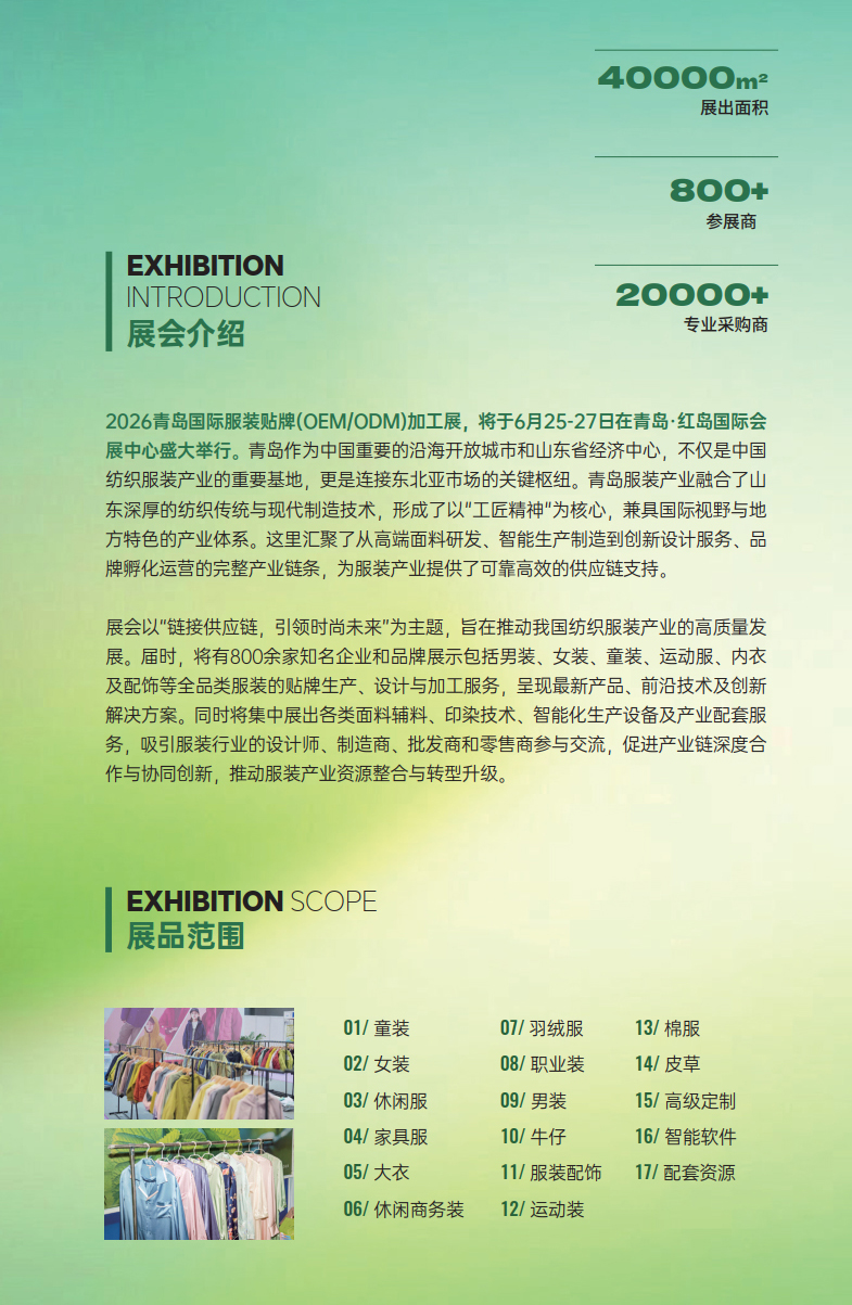 2026青岛国际服装贴牌(OEM/ODM)加工展,将于6月25-27日在青岛·红岛国际会展中心盛大举行。青岛作为中国重要的沿海开放城市和山东省经济中心,不仅是中国纺织服装产业的重要基地,更是连接东北亚市场的关键枢纽。青岛服装产业融合了山东深厚的纺织传统与现代制造技术,形成了以"工匠精神"为核心,兼具国际视野与地方特色的产业体系。这里汇聚了从高端面料研发、智能生产制造到创新设计服务、品牌孵化运营的完整产业链条,为服装产业提供了可靠高效的供应链支持。
