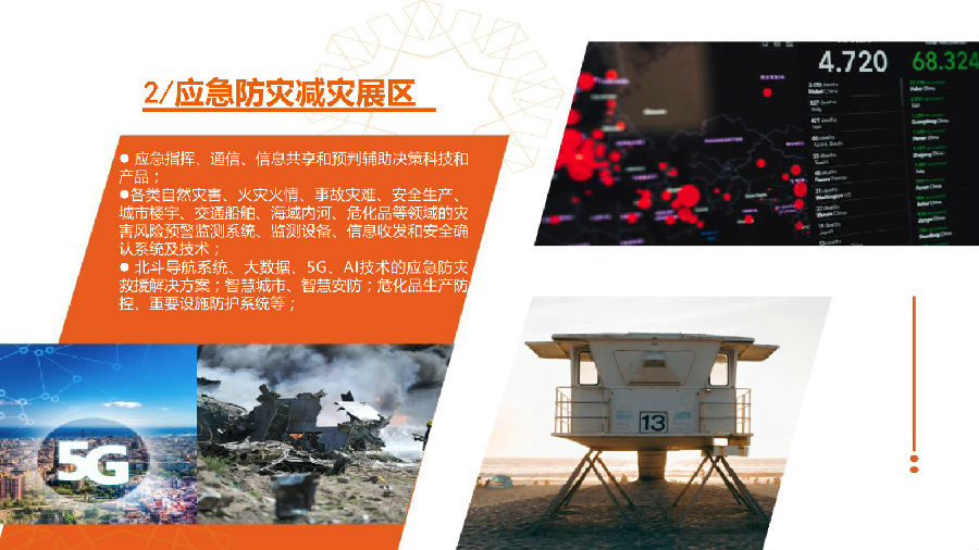 1. 应急防灾减灾展区:应急指挥、通信、信息共享和预判辅助决策科技和产品;各类自然灾害、火灾火情、事故灾难、安全生产、城市楼宇、交通船舶、海域内河、危化品等领域的灾害风险预警监测系统、监测设备、信息收发和安全确认系统及技术;北斗导航系统、大数据、5G、AI技术的应急防灾救援解决方案;智慧城市、智慧安防;危化品生产防控、重要设施防护系统等;