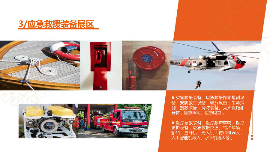 2. 应急救援装备展区:灾害救援装备、应急救援探索检测设备、安防救生设备、破拆设备;消防装备、灭火设施和器材;应急照明、应急电力;医疗急救装备、医疗救护车辆、医疗防护设备;应急救援交通、特种车辆、船舶、直升机、无人机;特种机器人、人工智能机器人、水下机器人等;