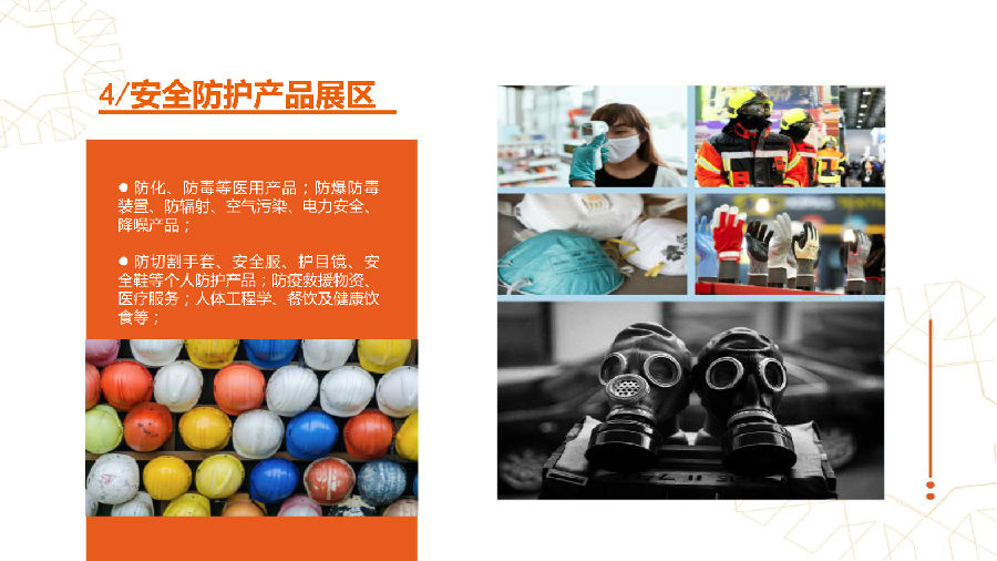 3. 安全防护产品展区:防化、防毒等医用产品;防爆防毒装置、防辐射、空气污染、电力安全、降噪产品;防切割手套、安全服、护目镜、安全鞋等个人防护产品;防疫救援物资、医疗服务;人体工程学、餐饮及健康饮食等;