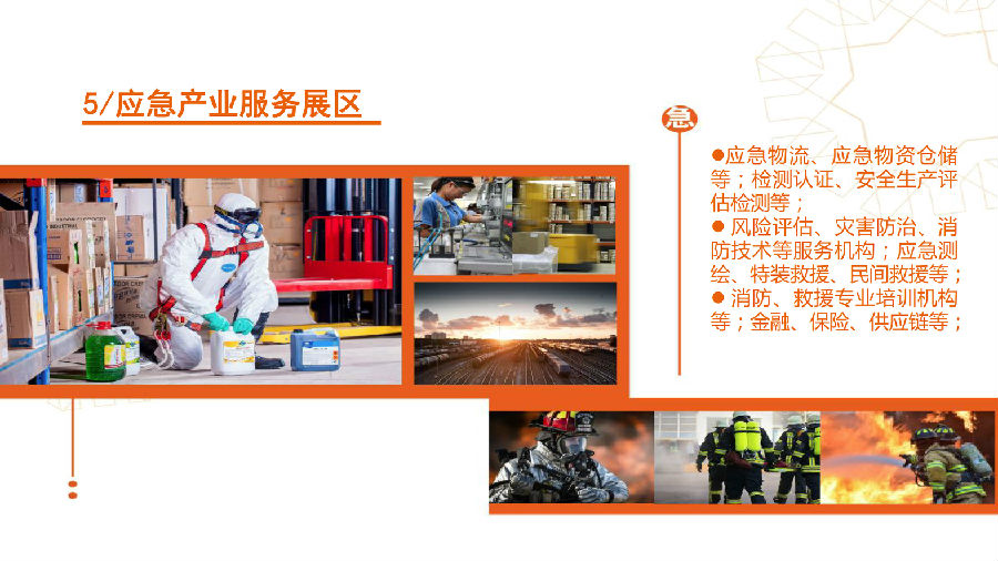 4. 应急产业服务展区:风险评估、灾害防治、消防技术等服务机构;应急测绘、特装救援、民间救援等;应急物流、应急物资仓储等;检测认证、安全生产评估检测等;消防、救援专业培训机构等;金融、保险、供应链等;