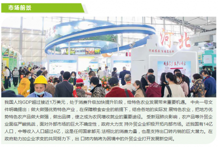 随着《“健康中国2030”规划纲要》的发布,大健康农业产业也走上了特色发展之路。《特色农产品优势区建设规划纲要》鼓励地方做大做强优势特色产业, 争创特色农产品优势区。据不完全统计,我国各类特色农产品产值达到5万亿元左右,占据我国农业的“半壁江山”。受***影响,农产品等外贸企业面临 严峻挑战,面对外部市场的巨大不确定性,政府大力支持外贸企业积极开拓内部市场。近日召开的中共中央政治局会议明确提出要支持企业出口转内销,国家和 地区相关部门积极推动具体政策落地。外贸企业出口转内销已见到成效,4月份出口企业内销额增长17%。我国有14亿人口,中等收入人口超过4亿,这是任何 国家都无法相比的消费力量,也是支持出口转内销的巨大潜力。在政府助力加企业求变的共同努力下,出口转内销将为困境中的外贸企业打开发展新空间。