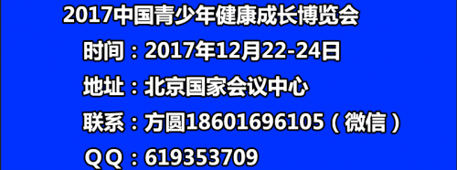 2017中国青少年健康成长博览会 时间: 2017-12-22-24日 地址:北京国家会议中心(朝阳区天辰东路7号) 主办单位: 共青团中央网络影视中心 承办单位:未来网 北京中展华博展览服务有……阅读全文>>会议时间:2017-12-22至2017-12-24  举办地点:北京国家会议中心