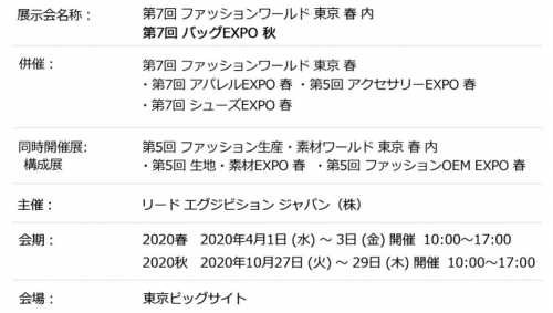 展会名称:FASHION WORLD TOKYO 2020 [4月展]日本东京箱包展
