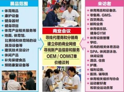本次2019日本体育用品展展品范围有针对性,展品范围较广泛,涵盖了贸易展销会和业务拓展,及世博会相关体育用品和行业设备,其中包括运动及健身设备;健身机器和项目;营养品、保健品和功能食品;预防保健和康复设备和用品; 日本超过300家参展商提供产品有用在主要的体育赛事上,并成为2019年热门的趋势和畅销产品。