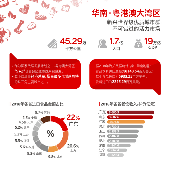 世界瞩目的粤港澳大湾区“9+2”世界超级城市群,在2019年2月被正式纳入国家战略发展计划。是中国开放程度最高、经济活力最强的区域之一。在国家规划纲要中,至2035年大湾区将全面建设成为以创新为主要经济支撑,宜居、宜业、宜游的国际一流优质生活圈。为顺应大湾区发展规划,食品及饮料行业将迎来新的巨大的市场挑战和契机。