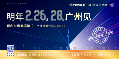 2023 年 2 月 26 日 -28 日,第三届华南中酒展即将在广州举办。这场汇聚选品、招商、趋势与机遇的酒展将成为开启明年机遇的首场行业盛会。展位销售已突破 70% , 抢占酒业大商机,跟……阅读全文>>展会日期:2023-02-26至2023-02-28  举办展馆:广州保利世贸博览馆
