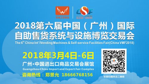 2018第六届中国(广州)国际自助售货系统与设施博览交易会 China Int’l Vending Machines Self-service Facilities Fair 201 8 时间: 2018年3月4日-6日 地点:广州·广交会展馆 主题:融合创新 自助科技……阅读全文>>展会日期:2018-03-04至2018-03-06  举办展馆:广州·广交会展馆