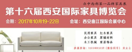 第十六届西安国际家具博览会 会期: 2017年10月19-22日 会址:西安曲江国际会展中心 邀 请 函 批准单位:陕西省人民政府 支持单位:陕西省工业和信息化厅 / 陕西省商务厅 主办单位:……阅读全文>>展会日期:2017-10-19至2017-10-22  举办展馆:西安曲江国际会展中心