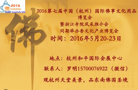 2016第七届中国(杭州)国际佛事文化用品博览会 暨 首届 浙江寺院风采推介会 同期举办: 2016杭州国际香文化产业博览会 邀请函 【展览时间】:201 6 年 5 月 20 日- 23 日 【展览地点】……阅读全文>>展会日期:2016-05-20至2016-05-23  举办展馆:杭州和平国际会展中心