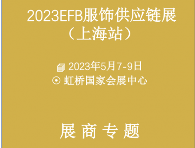 9大展会同期联动,打造服装产业一站式商贸对接平台 展出面积150000㎡ 观众人次160000+ 展商数量2000+ 现场活动100+ 2023EFB上海国际服饰供应链博览会 展会时间:2023年5月7-9日 展会地点:虹……阅读全文>>展会日期:2023-05-07至2023-05-09  举办展馆:国家会展中心(上海)